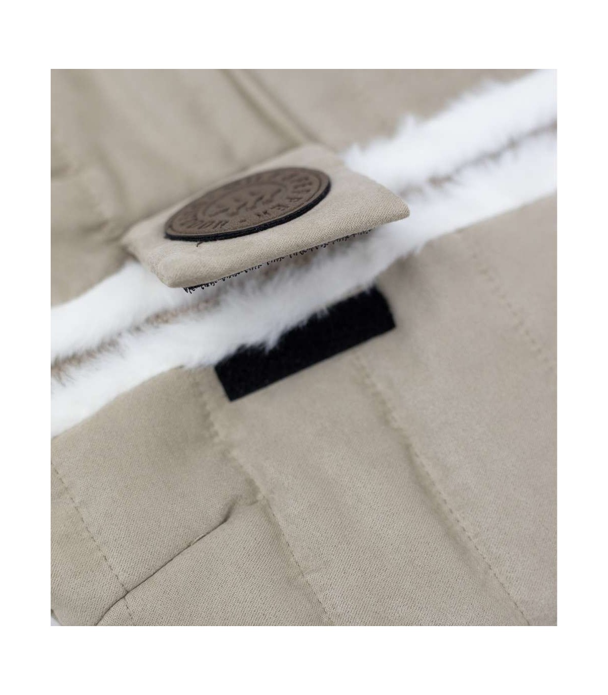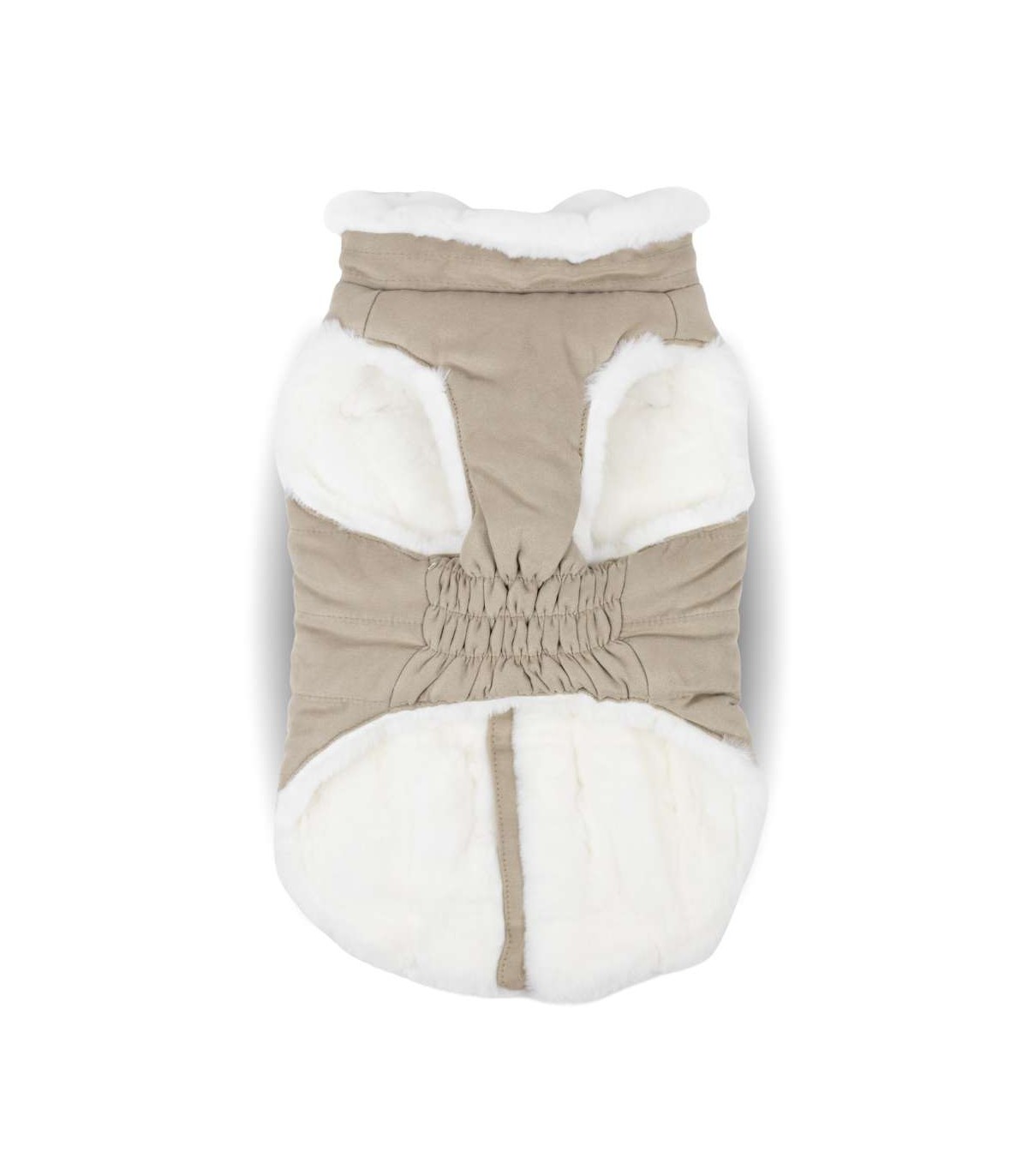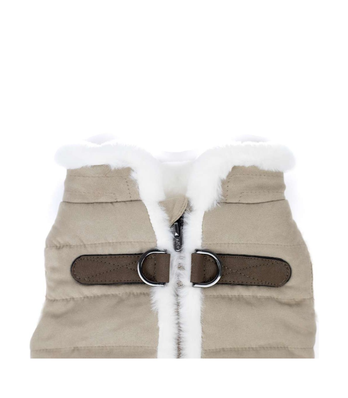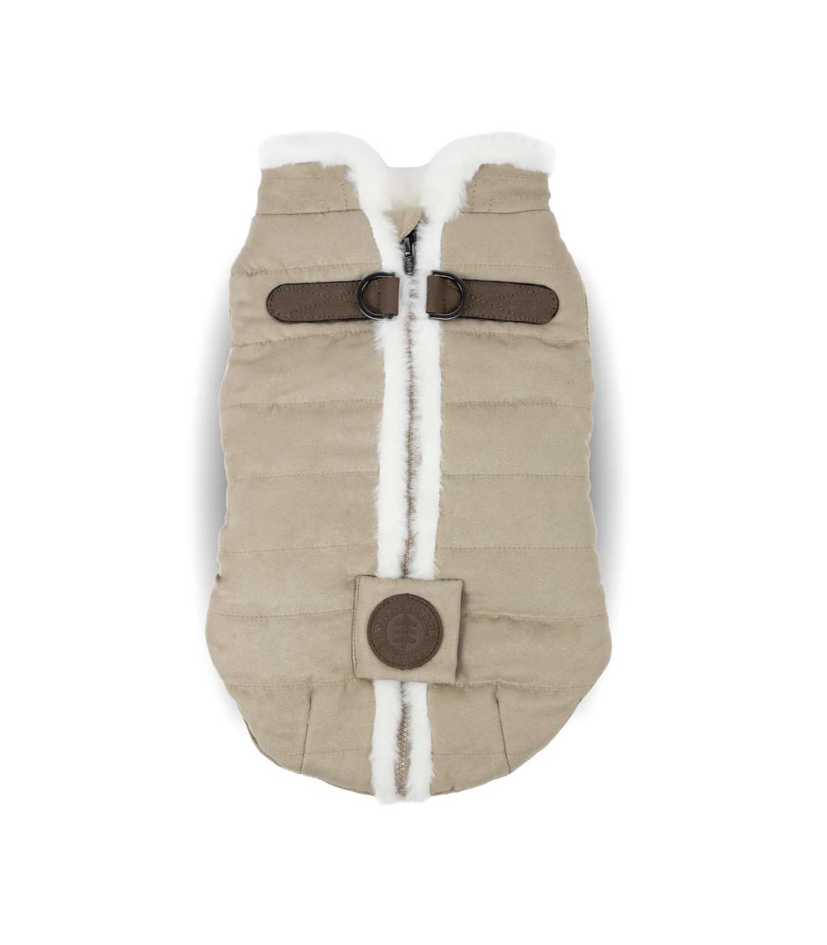 Abrigo con arnés incorporado para perro pequeño de la marca Milk & Pepper. Con exterior como de antelina beige con detalles en piel vegana e interior de pelito sintético para un extra de calidez.