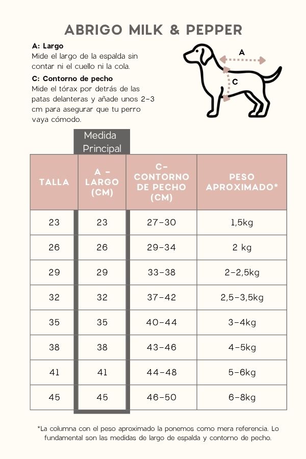 Disponible en distintas tallas para perros de pequeño tamaño -desde la 26 a la 45. Consulta la GUÍA DE TALLAS específica de este abrigo para acertar a la primera con la talla que necesita tu perro.