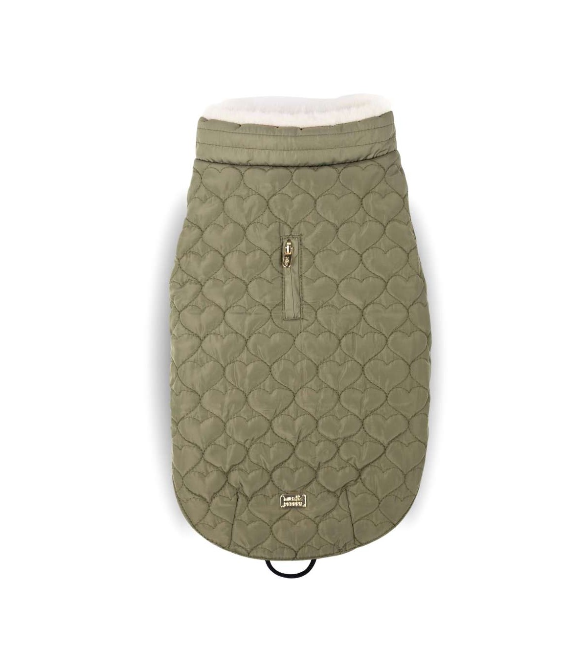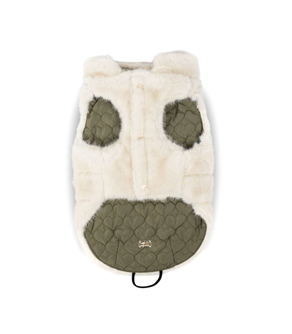 Abrigo para perro de tamaño pequeño de la marca francesa Milk & Pepper. Con este abrigo tendrás 2 en 1 ya que es reversible: por un lado, es verde oliva, con costuras con forma de corazón, tipo plumas, mientras que por el otro es de pelito crema, muy suave al tacto.