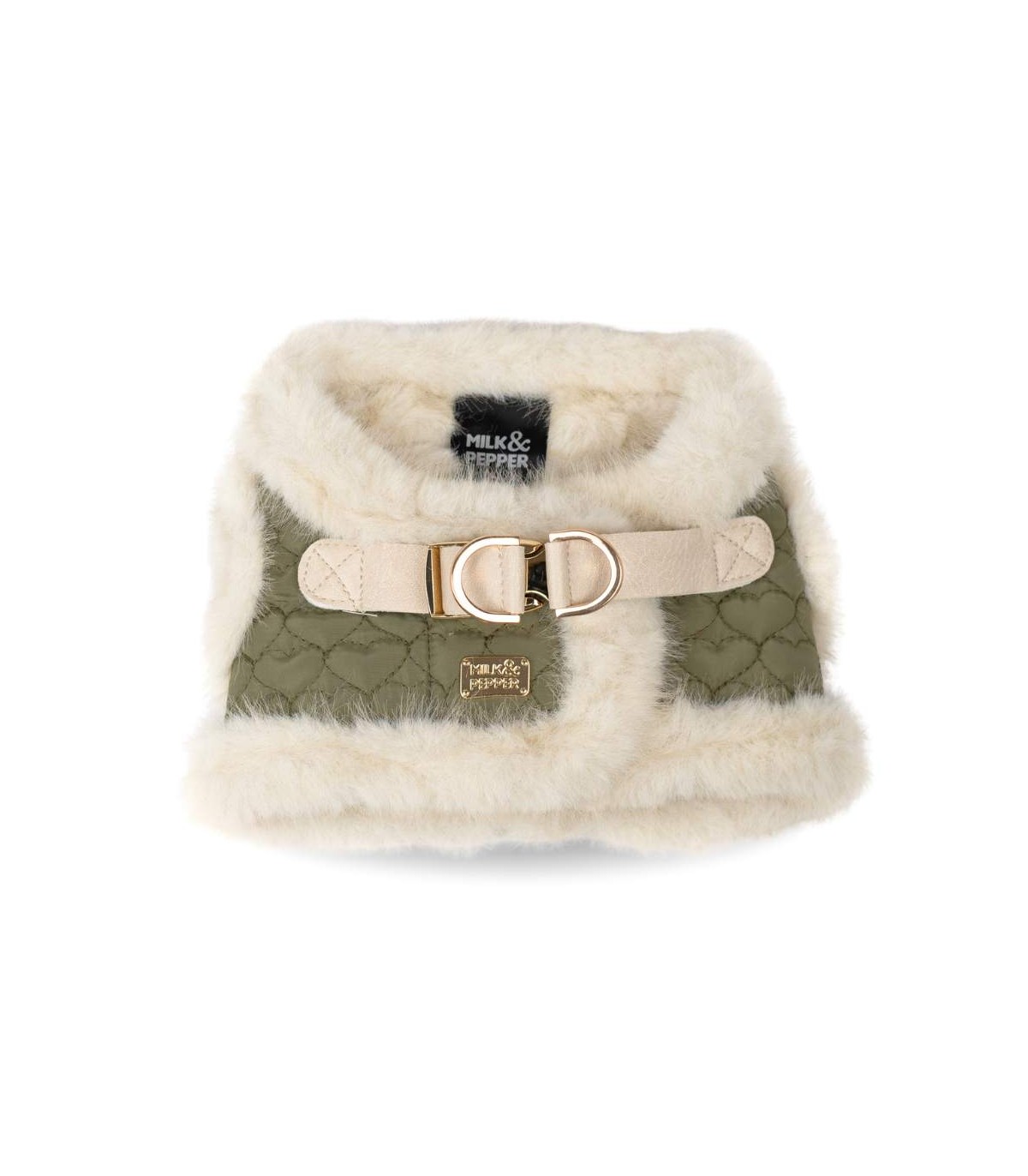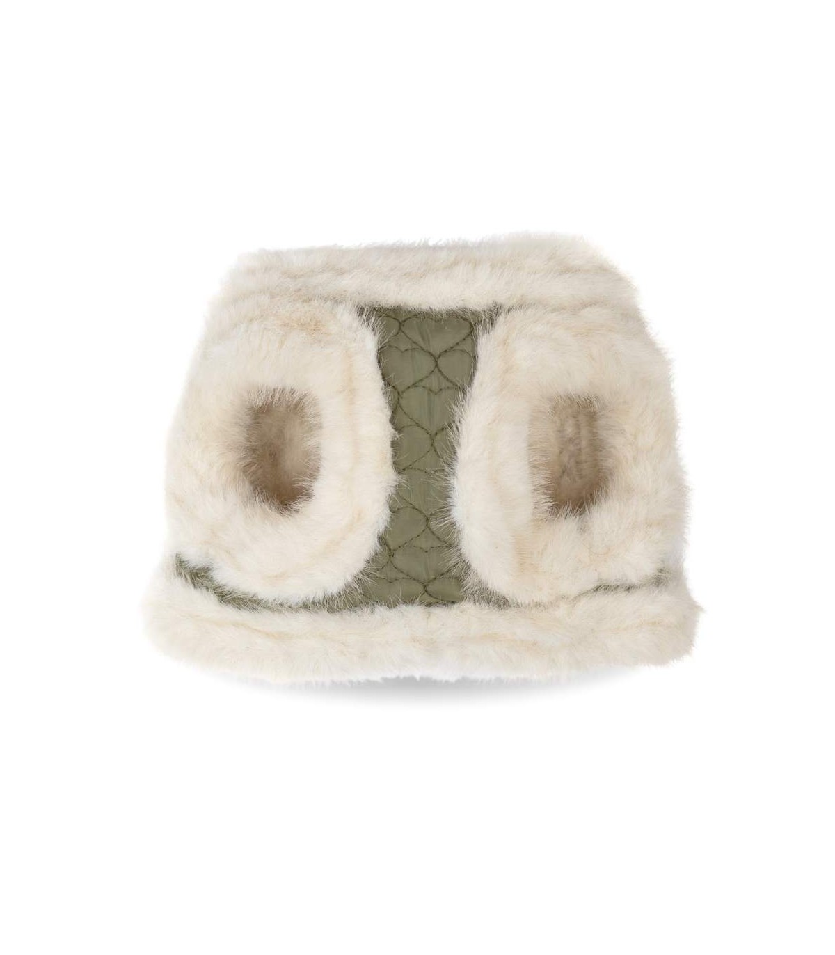 El interior está completamente cubierto de borreguito ultrasuave color blanco, mientras que el exterior, en color verde oliva, con costuras con forma de corazón. El contraste perfecto entre elegancia y resistencia.