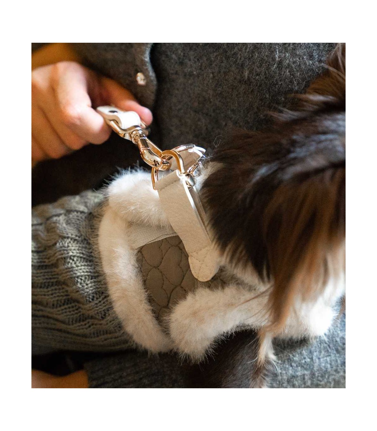 Arnés para perro de pequeño de la marca Milk & Pepper. El tejido de este arnés hace que también sea una prenda de abrigo, por lo que es ideal para los paseos en los meses más fríos.