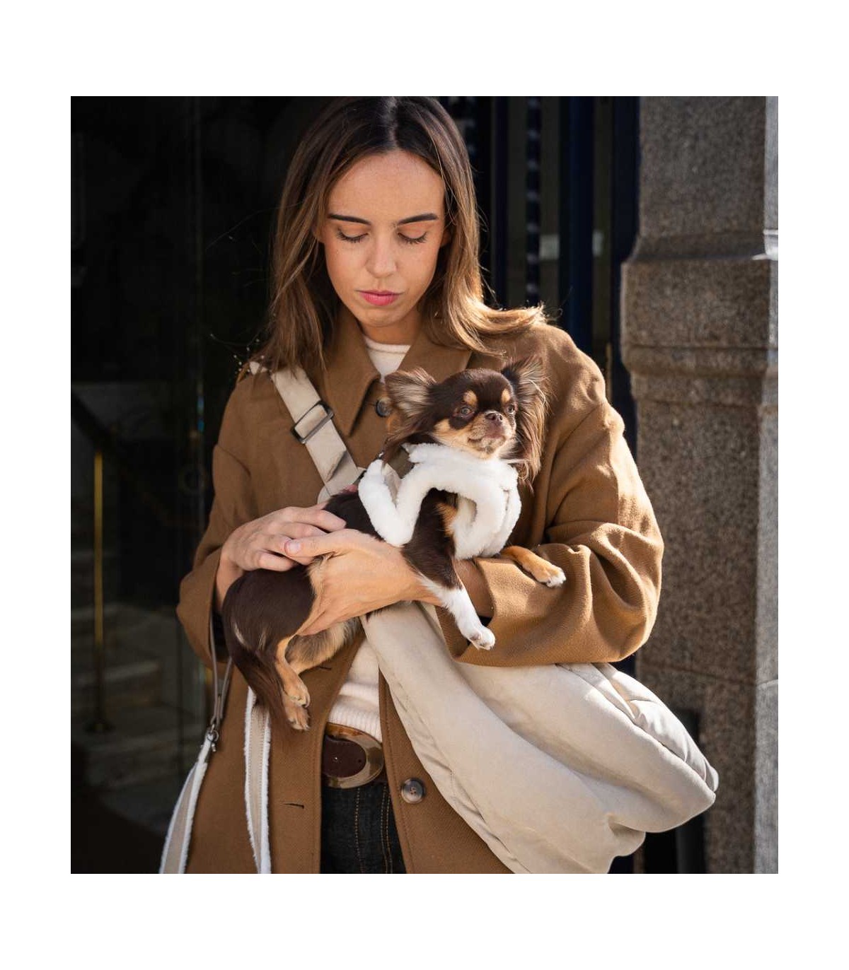 El interior está completamente cubierto de pelito ultrasuave color blanco, mientras que el exterior, en color beige, es de tejido de ante. El contraste perfecto entre elegancia y resistencia.