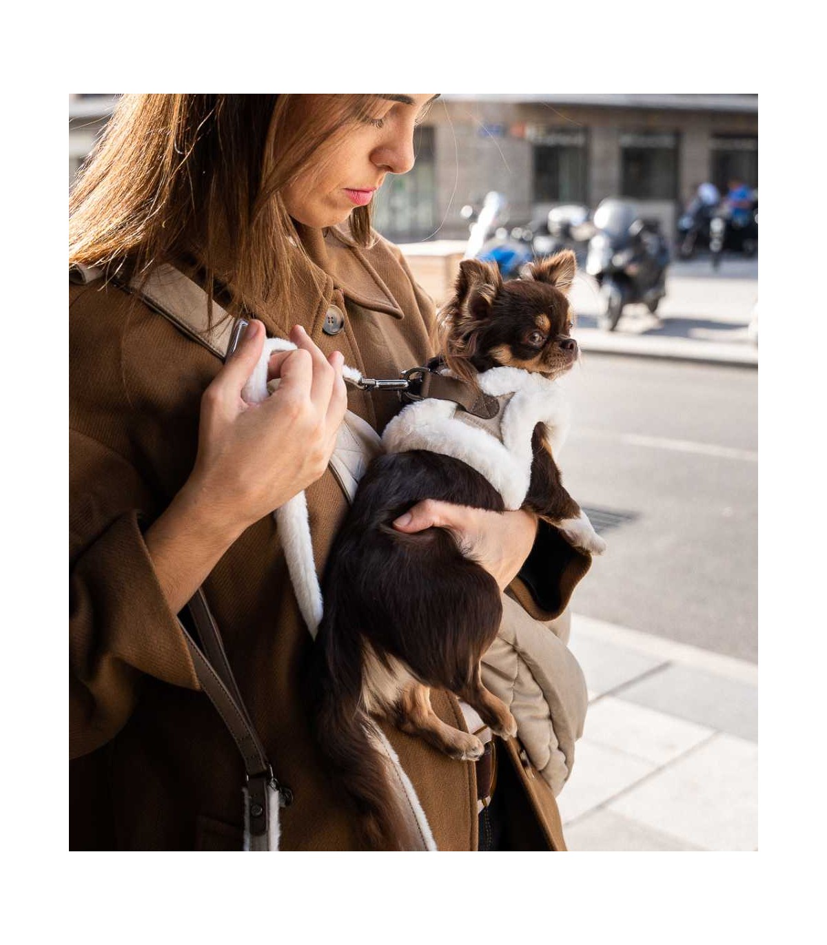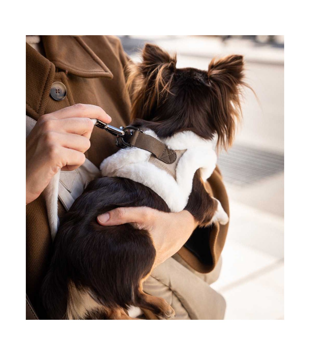 Arnés para perro de pequeño de la marca Milk & Pepper. El tejido de este arnés hace que también sea una prenda de abrigo, por lo que es ideal para los paseos en los meses más fríos.