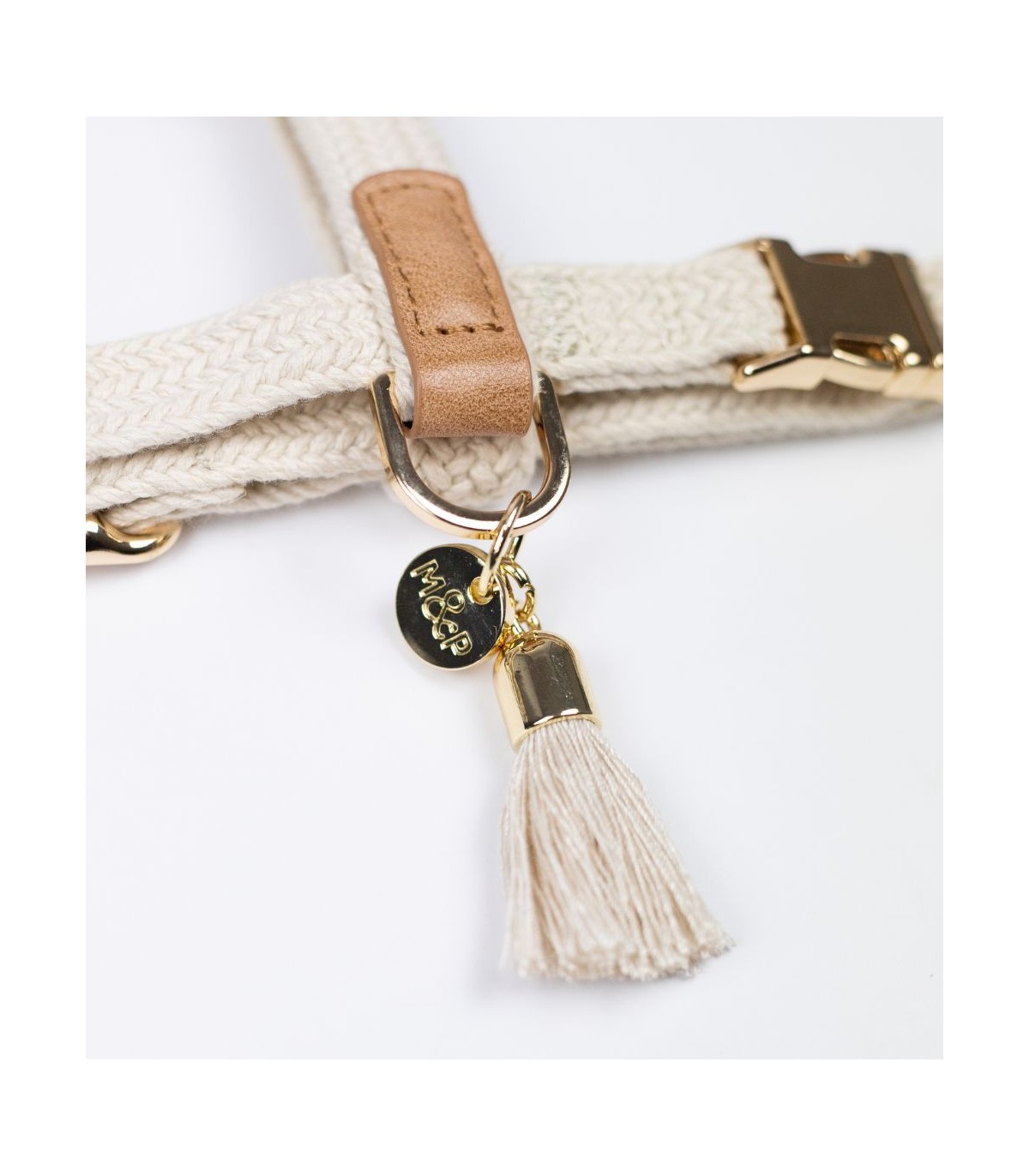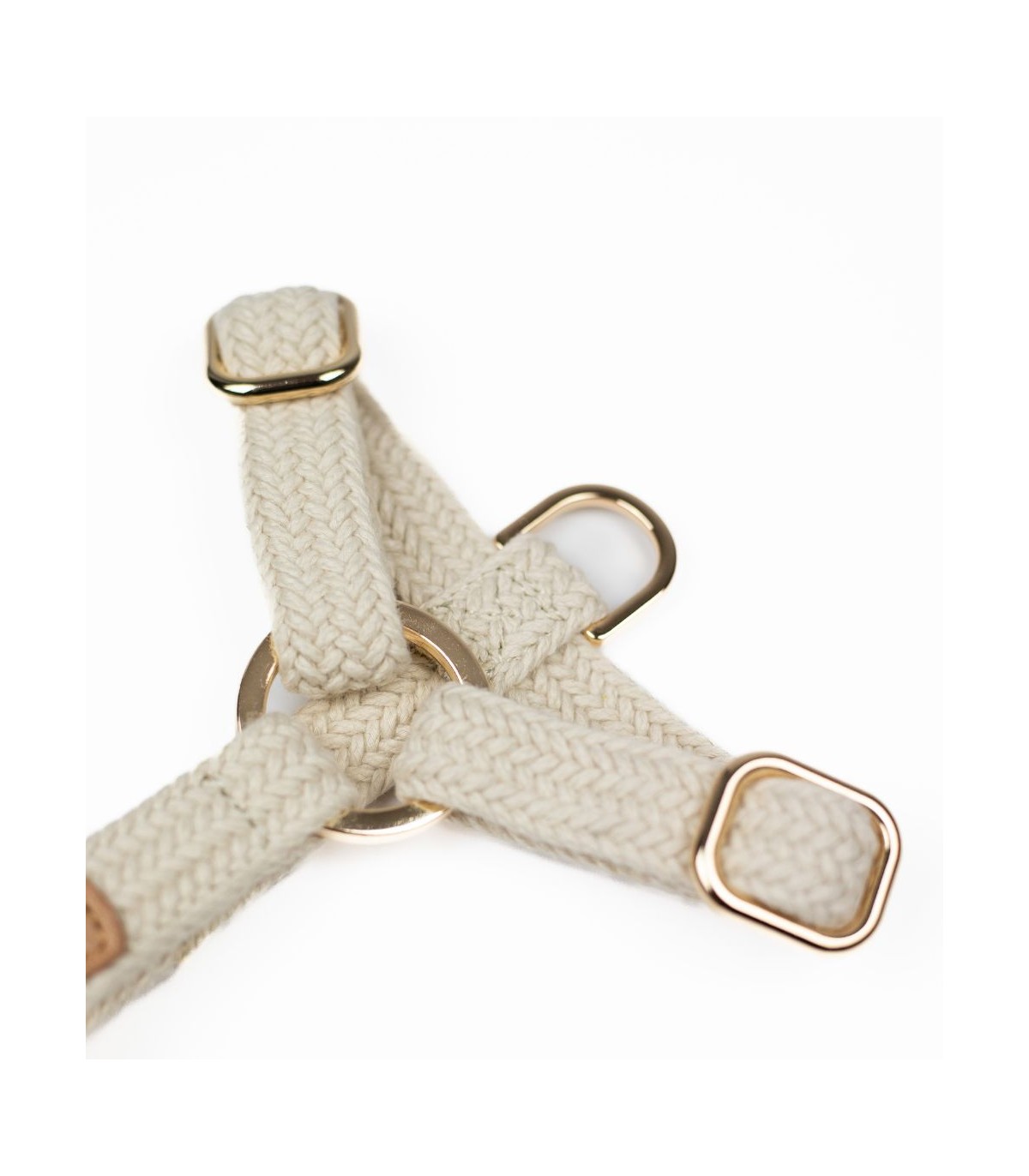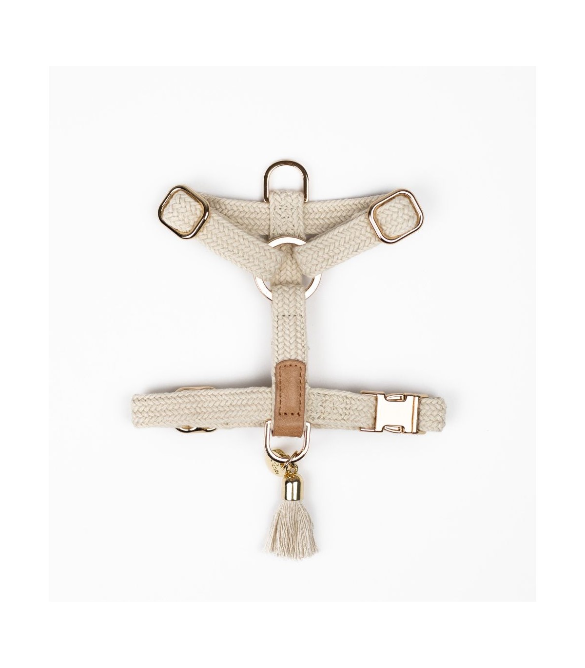 El Arnés Kaya en su versión crema combina funcionalidad y elegancia: cordón color crema, remates en piel camel y herrajes en metal dorado. Esta forma de arnés en H es la que recomiendan muchos veterinarios y educadores caninos, ya que permite que las articulaciones tengan total libertad de movimiento. Además, al engancharse la anilla en el centro, reparte muy bien el peso y la presión de los tirones, lo que evita lesiones al perro.