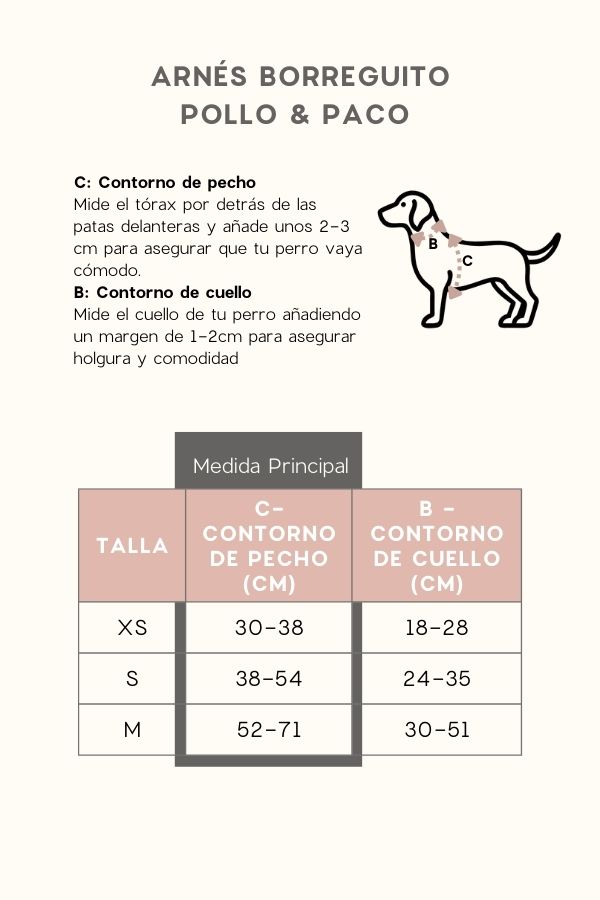Disponible en cuatro tamaños: XS, S y M. Consulta la GUÍA DE TALLAS específica de este arnés para más información sobre las medidas.