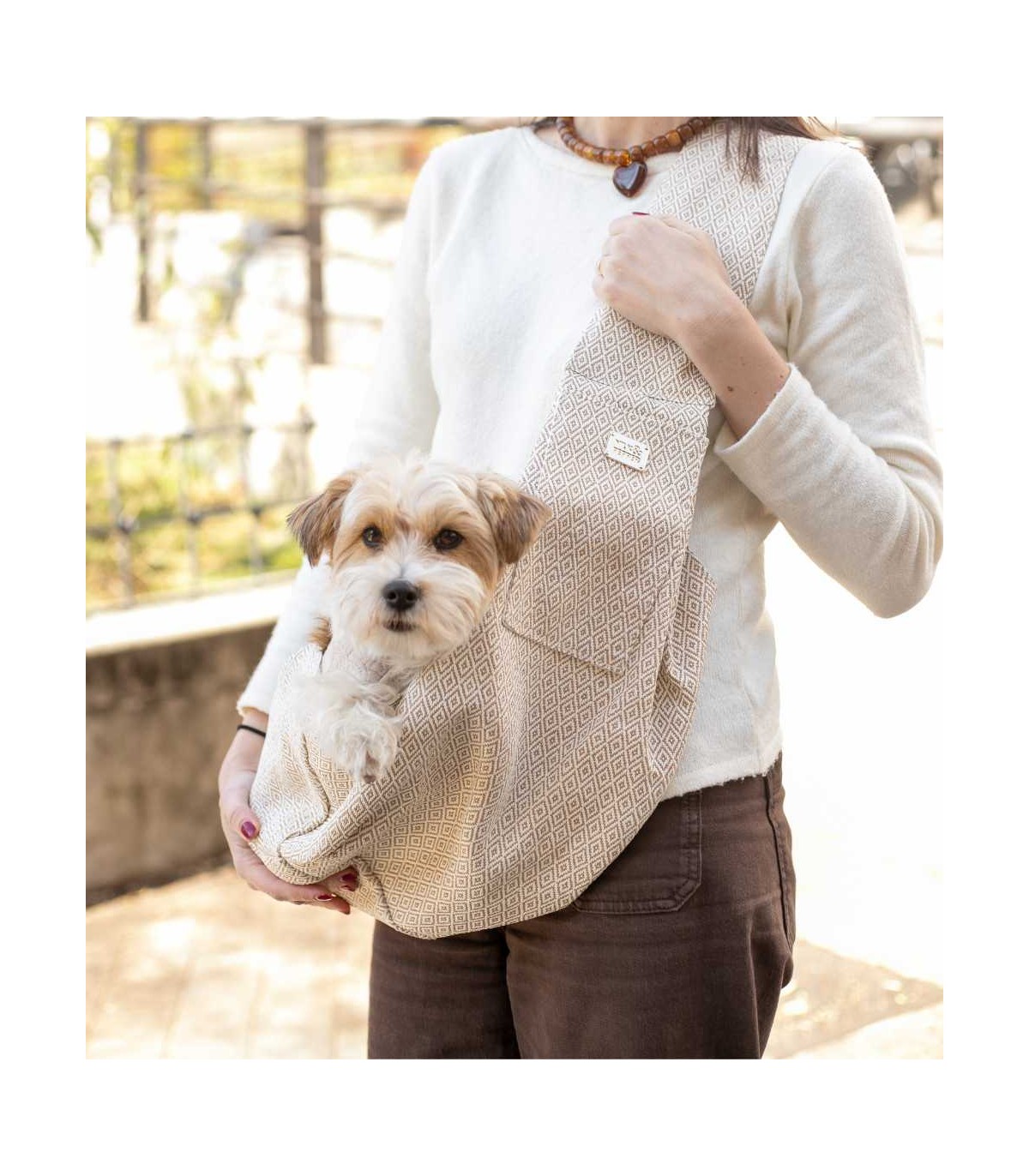 Esta bandolera es el accesorio ideal para pasear con un perro pequeño. Tanto si quieres llevarte a tu peludo de excursión, como a un paseo por la ciudad, cuando se canse agradecerás muchísimo contar con esta bandolera: solo tendrás que cruzártela al hombro, meter a tu perro y engancharlo al mosquetón de seguridad.