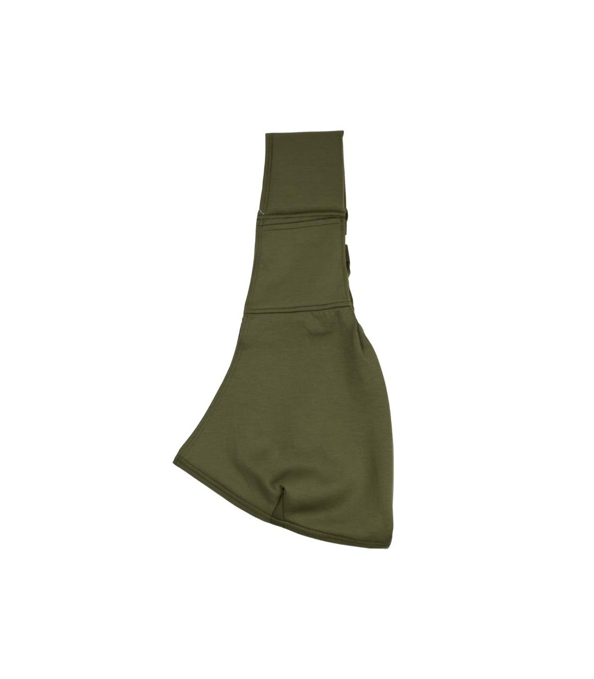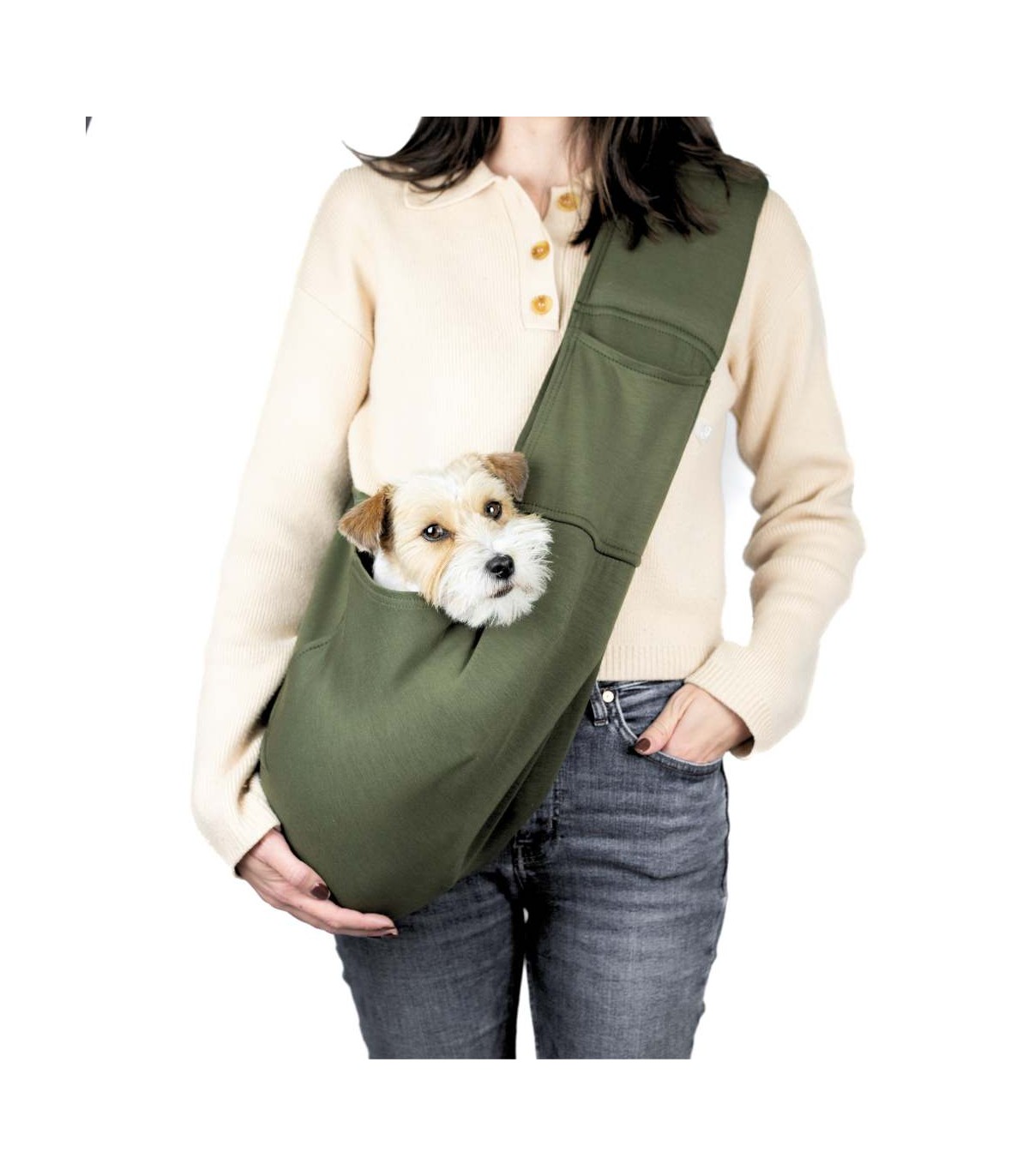 Esta bandolera tiene una textura tipo sudadera, ligera pero sólida y muy elástica. Tiene una estructura muy sencilla: una banda de tela que se pliega dejando hueco en el interior para colocar a tu perro. Puedes dejar que se asome, sin riesgo a caerse, sujetándolo del collar o el arnés gracias a la tira con mosquetón que incluye.