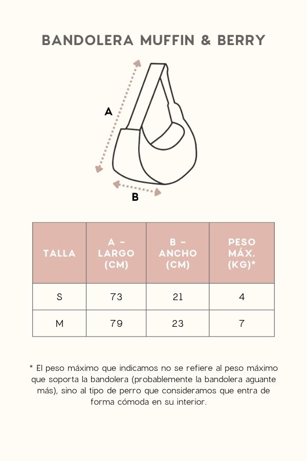 Disponible en dos tallas para adaptarse a perros toy y perros pequeños. Consulta la GUÍA DE TALLAS específica de esta bandolera para acertar con la talla que tu perro necesita.