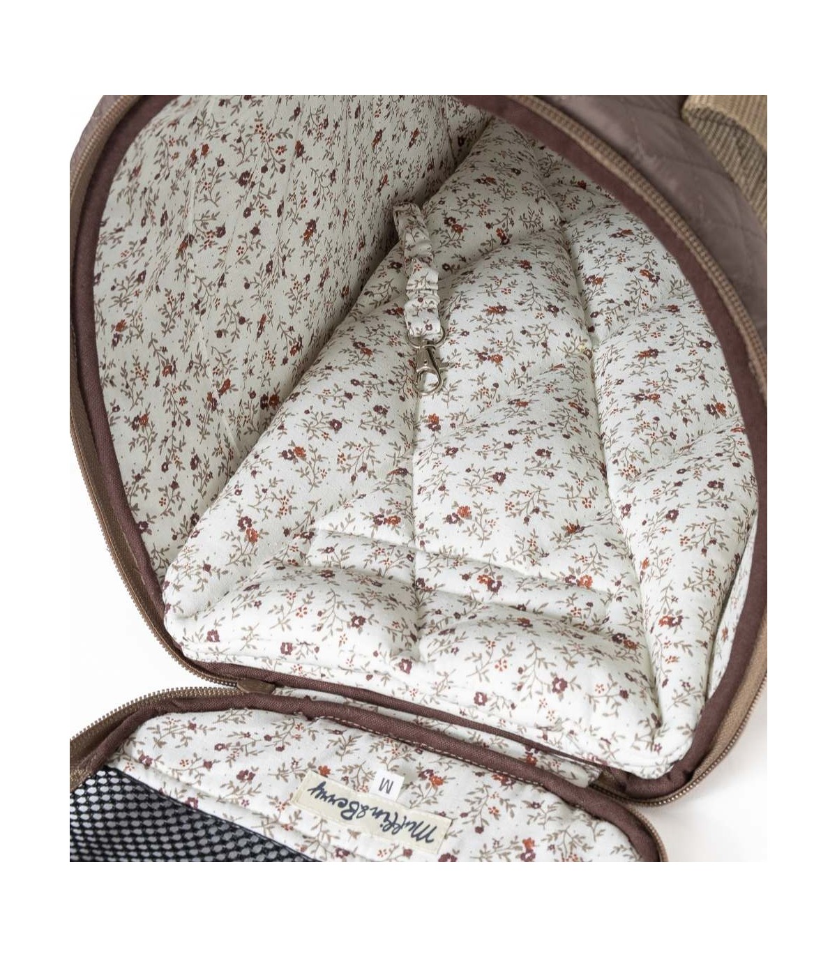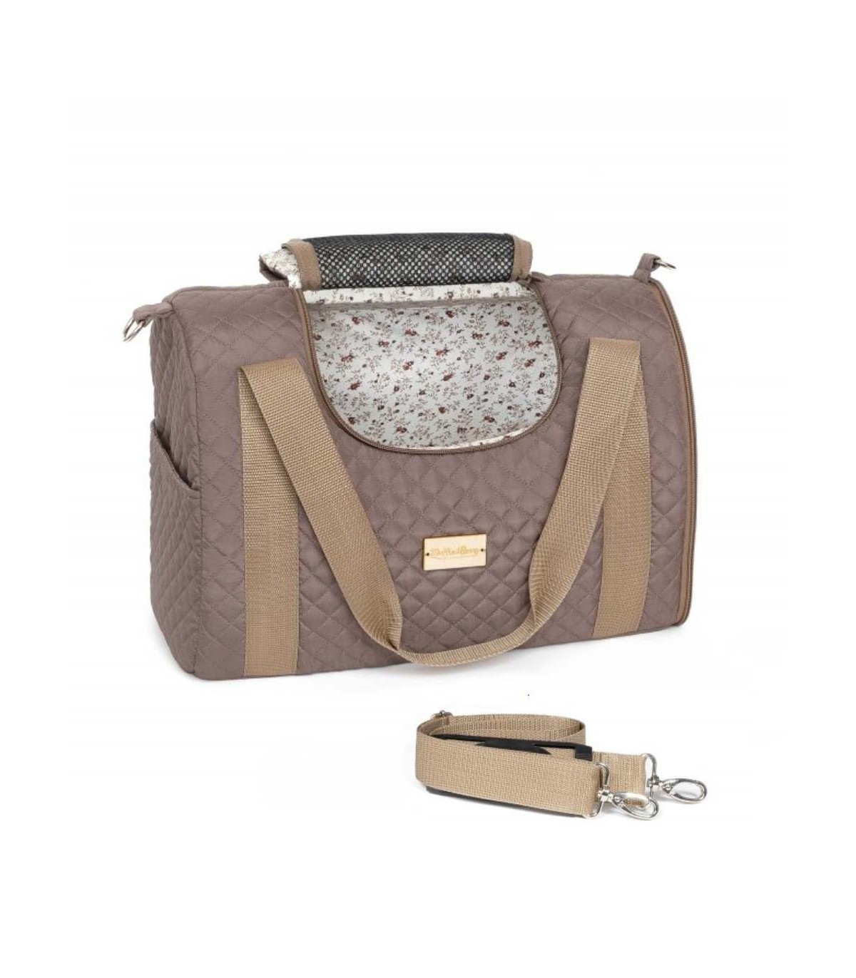 El bolso cuenta con dos asas cortas y un asa bandolera regulable. Así podrás colgártelo del hombro o cruzado y llevar libres las manos. Para una mejor circulación del aire, tiene malla por un lateral y en la parte superior. También cuenta con un gran bolsillo lateral por el exterior y un cojín interior que se puede quitar y lavar en lavadora.