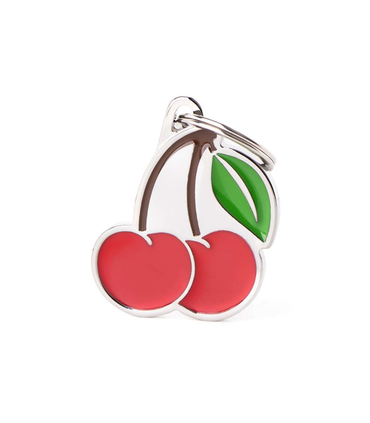 Chapa de identificación de la marca My Family con forma de cerezas.