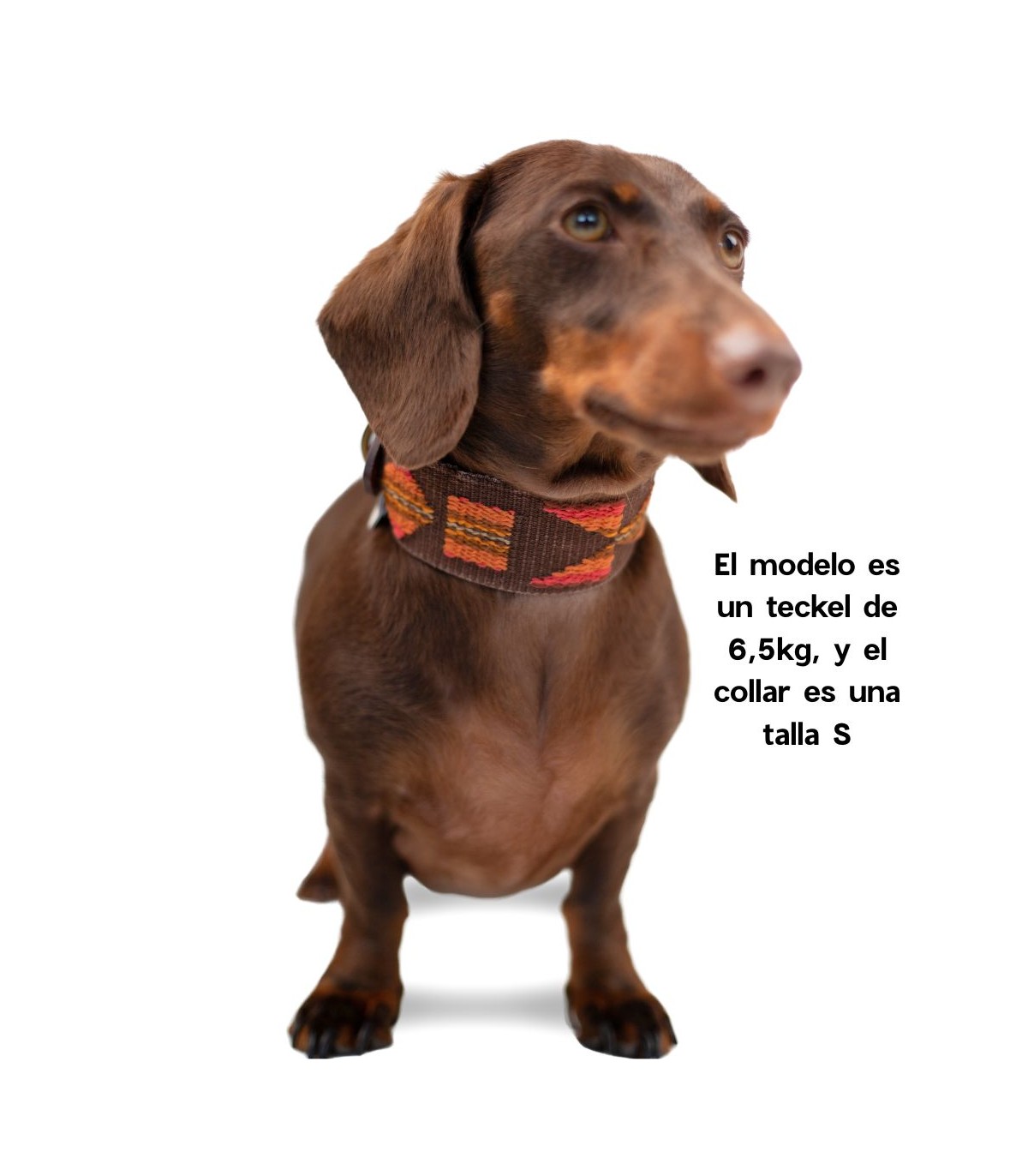 Collar para perro de la marca Buddys Dogwear. Elaborado artesanalmente en España con lona de algodón orgánico y con remates en piel de procedencia francesa. Este collar tiene un diseño étnico y colorido que te enamorará.