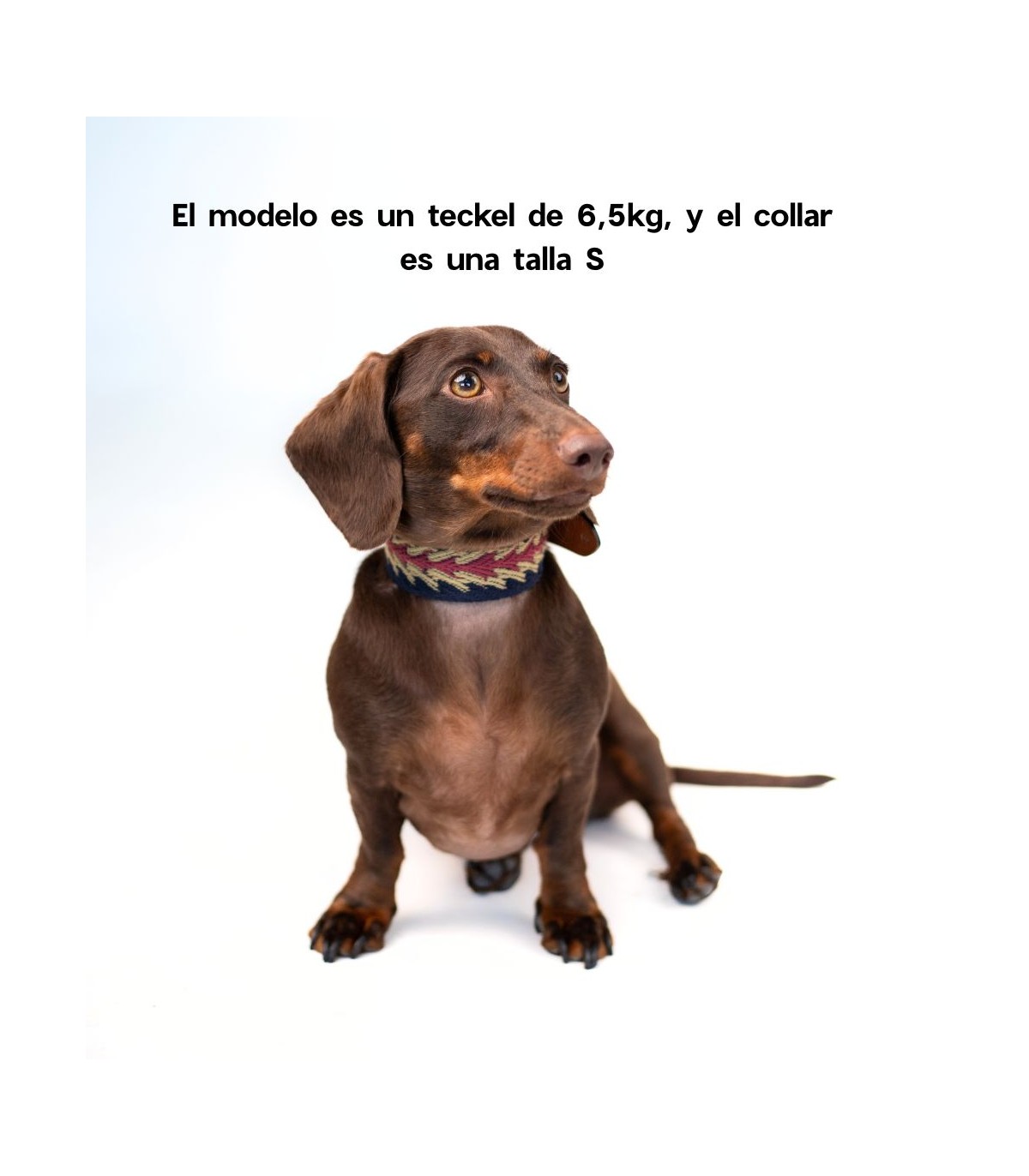 Collar para perro de la marca Buddys Dogwear. Elaborado artesanalmente en España con lona de algodón orgánico y con remates en piel de procedencia francesa. Este collar tiene un diseño étnico y colorido que te enamorará.