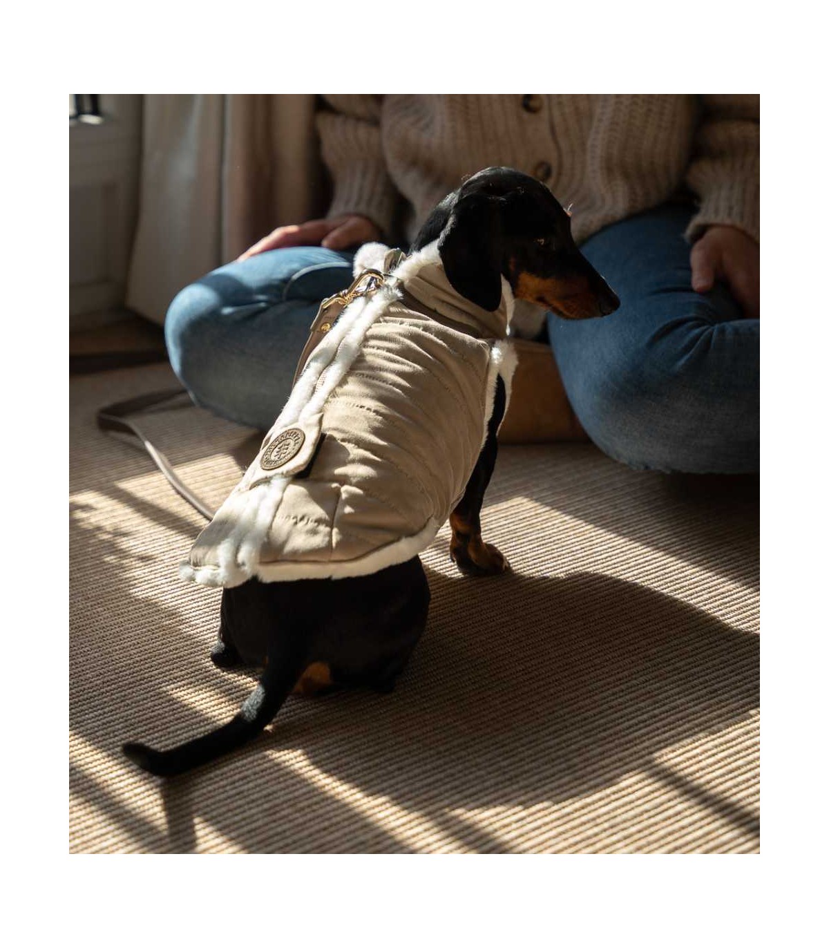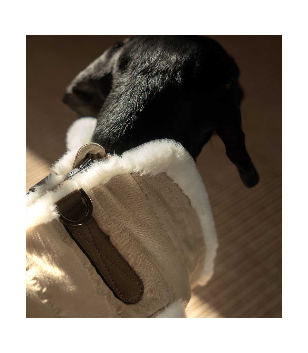 Abrigo con arnés incorporado para perro pequeño de la marca Milk & Pepper. Es tipo plumas, en color beige con detalles en piel vegana y cuello e interior de borreguito sintético para un extra de calidez.