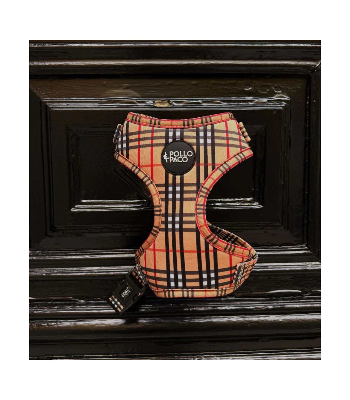 The special feature of this harness is that it adjusts both in the chest girth area and in the neck area. If you have trouble finding a harness that fits your dog well, you might find the solution with this one! Plus, you'll love its London-style checkered print.