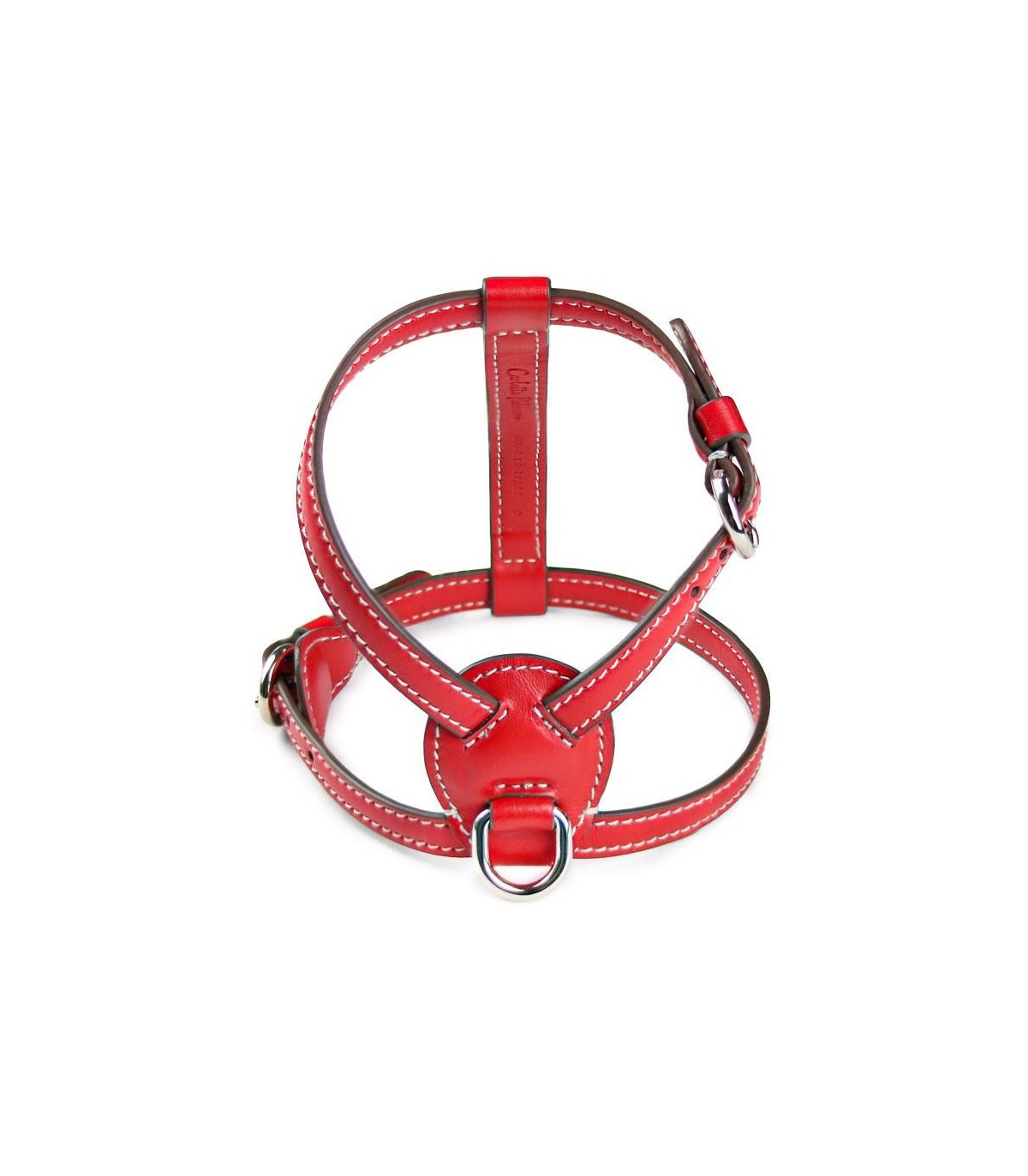 Confeccionado en Italia con piel de becerro de altísima calidad en un precioso color rojo. Este arnés se ha diseñado pensando totalmente en la comodidad de tu perro, para que camine "como si estuviera en una nube".