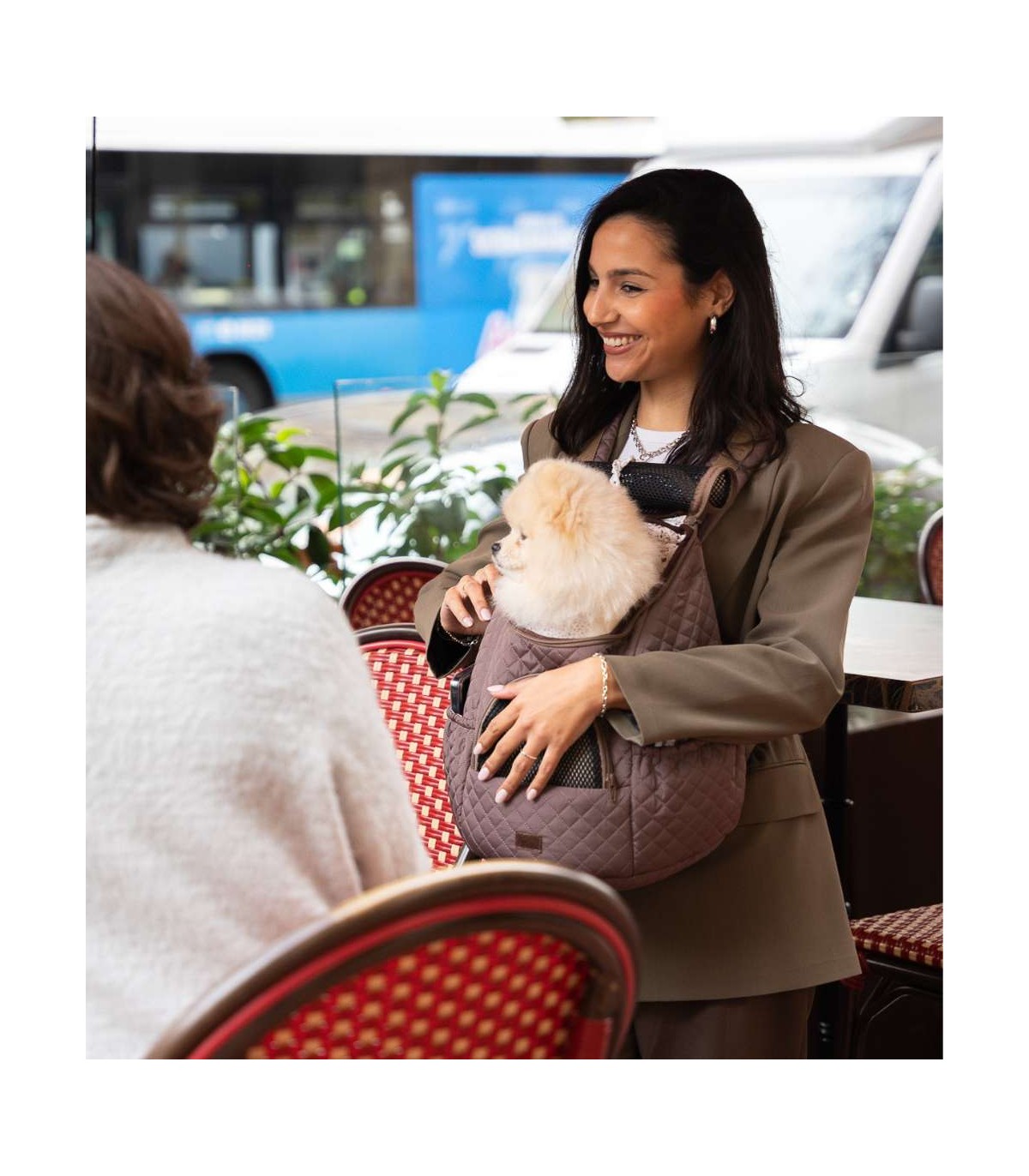 It features two exterior side pockets to store their things (treats, bags, toys...) or yours.