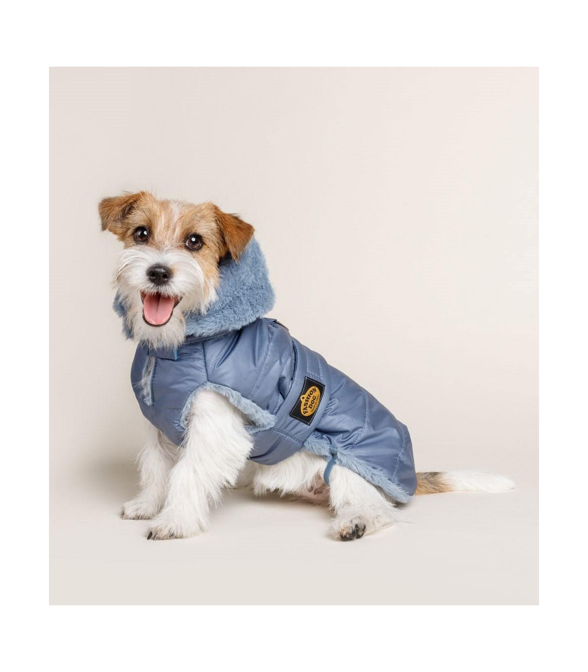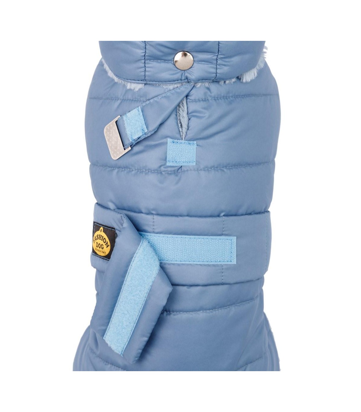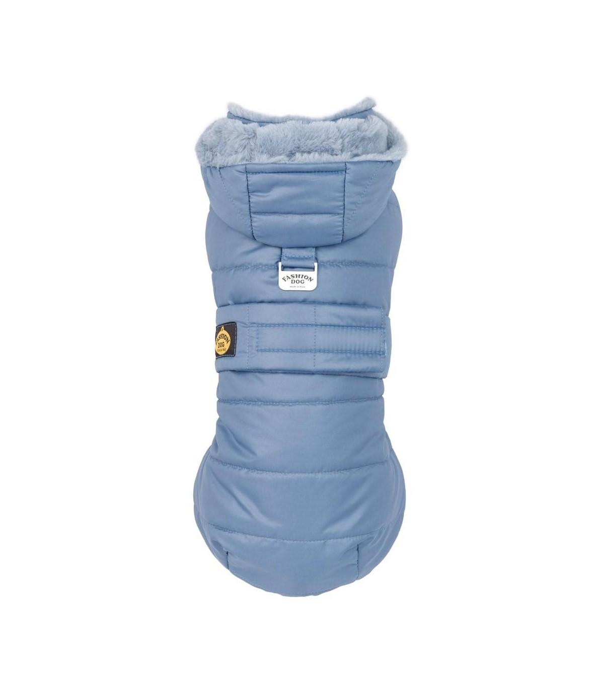 Abrigo para perro de la marca Fashion Dog. Este abrigo tipo plumas en color azul claro y con forro de pelito sintético muy suave es un básico imprescindible para los días más fríos.