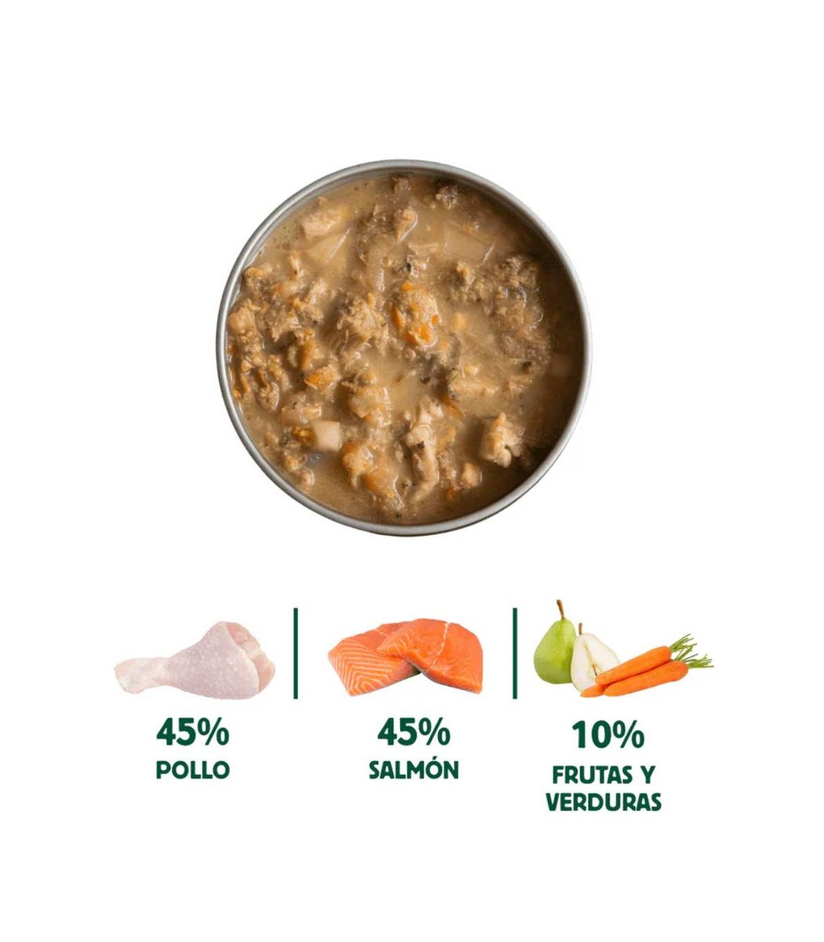 45% Salmón en su salsa, 45% Carne de pollo en su salsa, 4% Zanahoria, 4% Pera, 1% Especias (Cúrcuma, Cilantro y Perejil), 1% Vitaminas y Minerales.