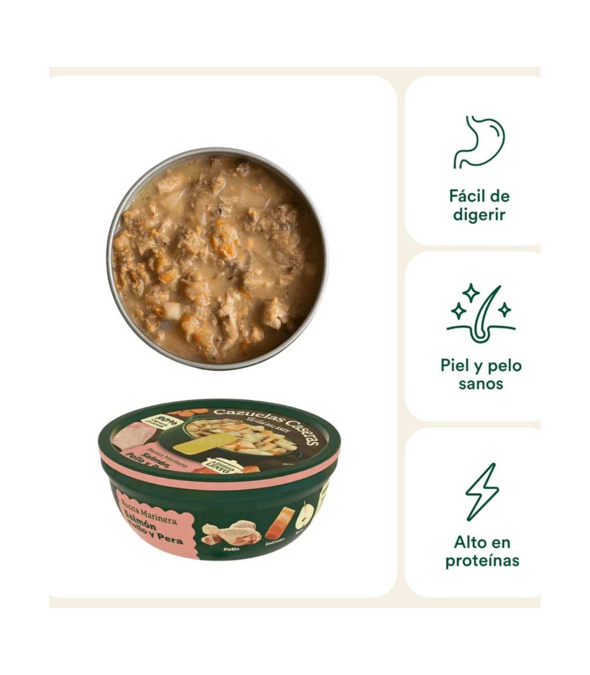 Las receta de esta cazuelas contiene un 90% de carne de cerdo en su salsa, complementada con frutas, verduras y vitaminas esenciales para mantener la alimentación completa de tu perro.