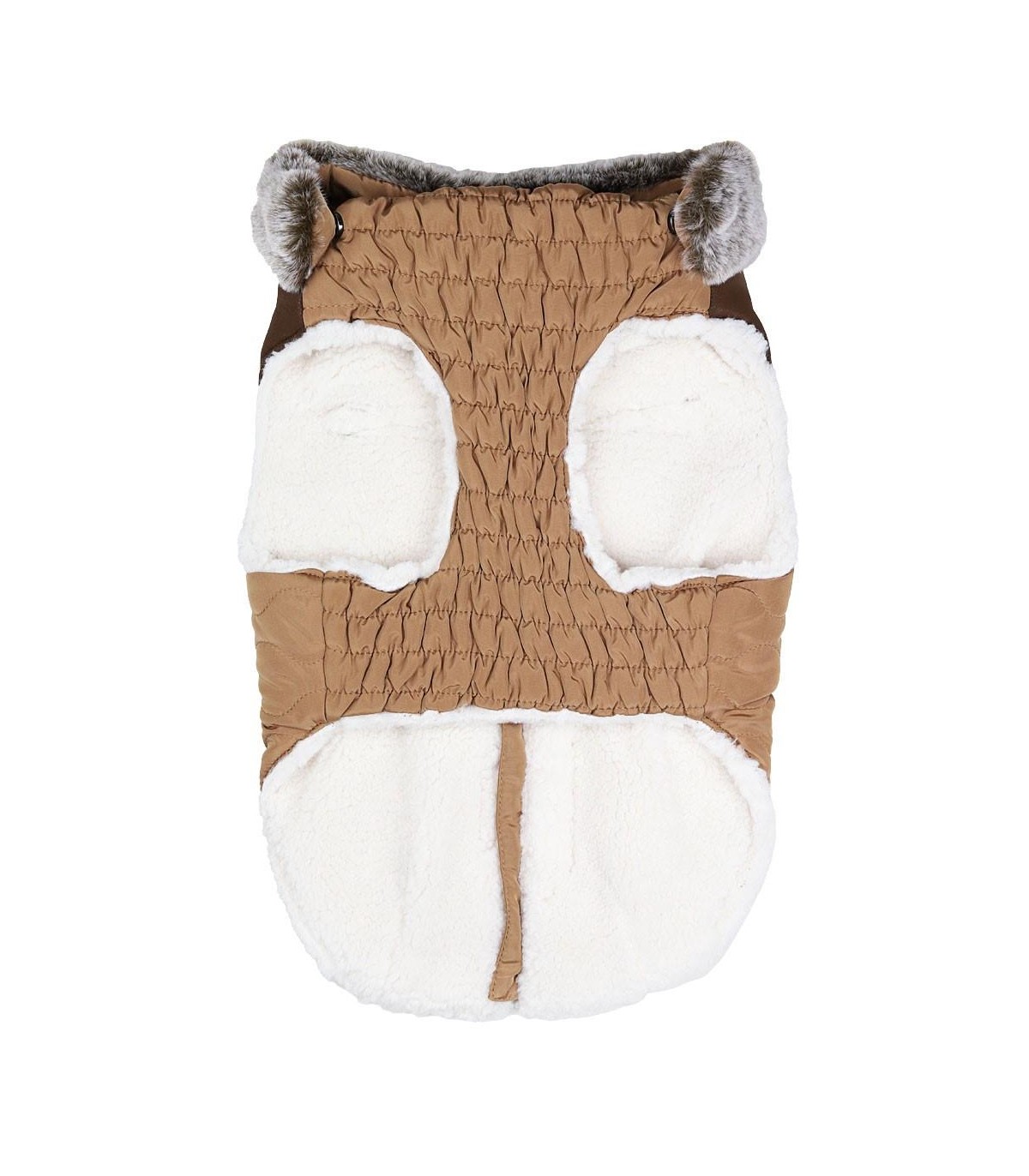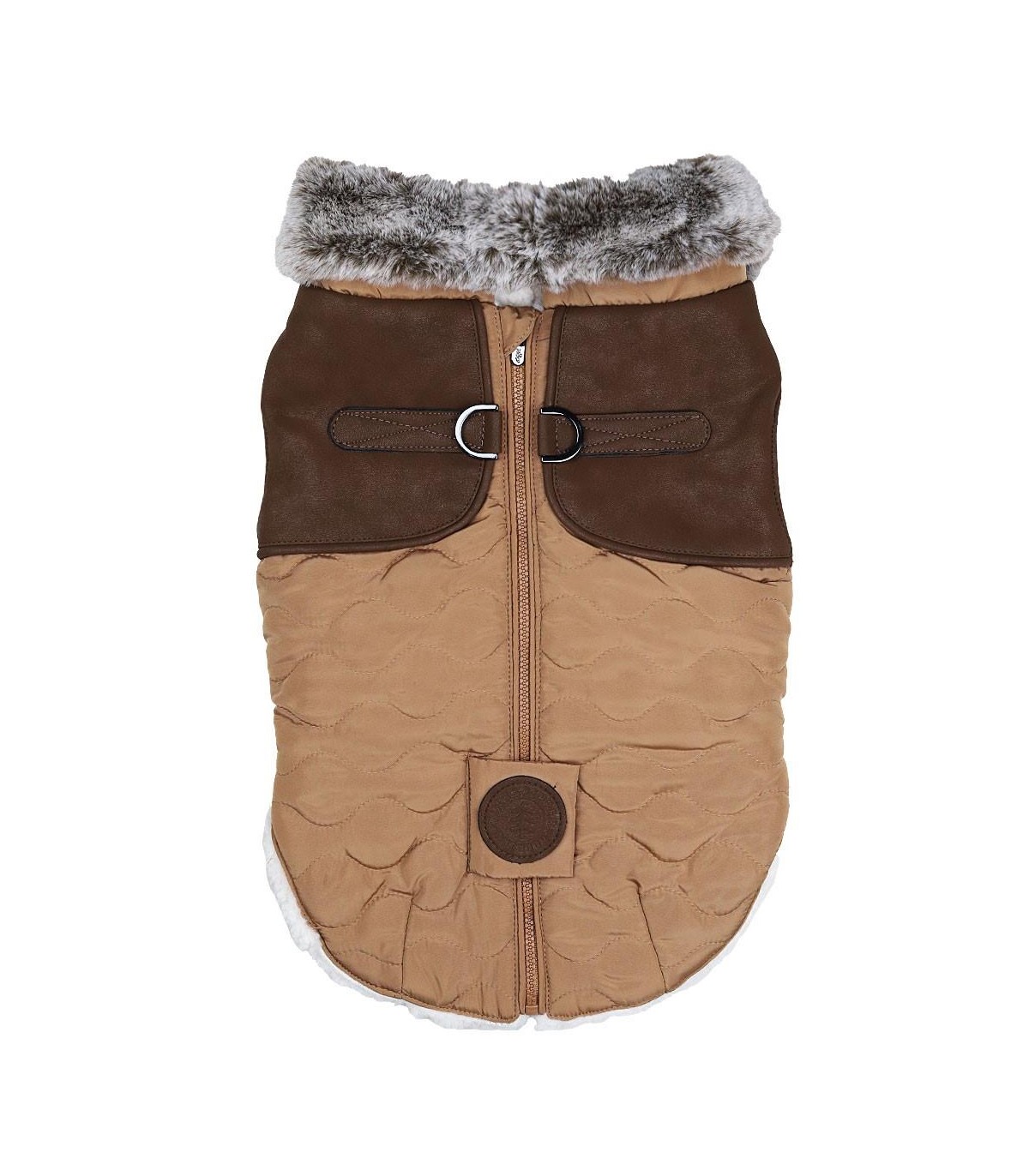 Coat with built-in harness for Bulldogs from the French brand Milk & Pepper. This coat has been designed for small dog breeds with a wider bone structure, who need special garments that fit their physique. It is a puffer style coat, in a lovely camel color with details in vegan leather and a collar with synthetic fur. For extra warmth, the interior is lined with white fleece.