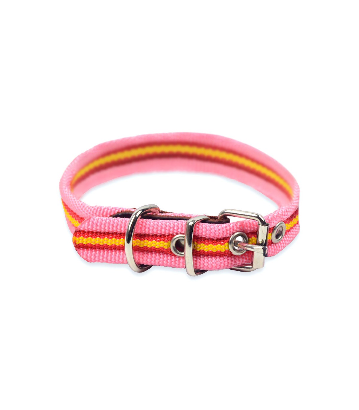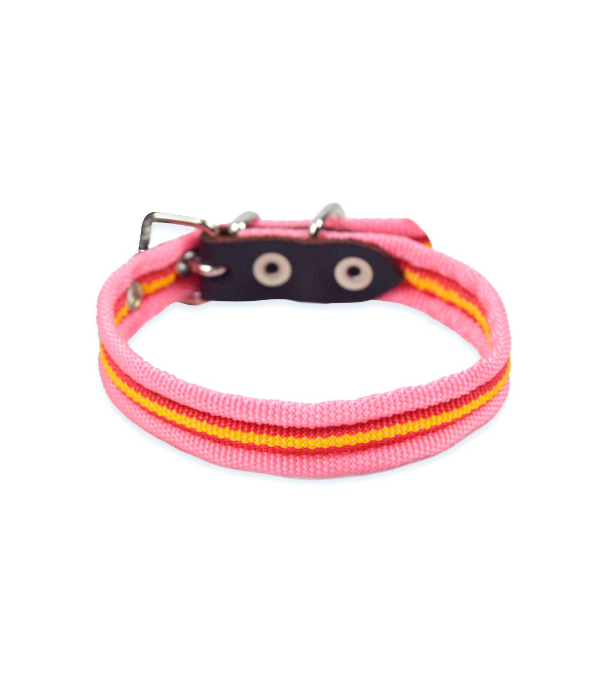 Este collar con la bandera de España y fondo rosa está hecho de nylon. Es fino, ligero y cómodo de llevar. Además, está fabricado en una sola pieza y rematado en un extremo con piel. La hebilla es metálica para mayor seguridad y resistencia frente a los tirones de tu perro.