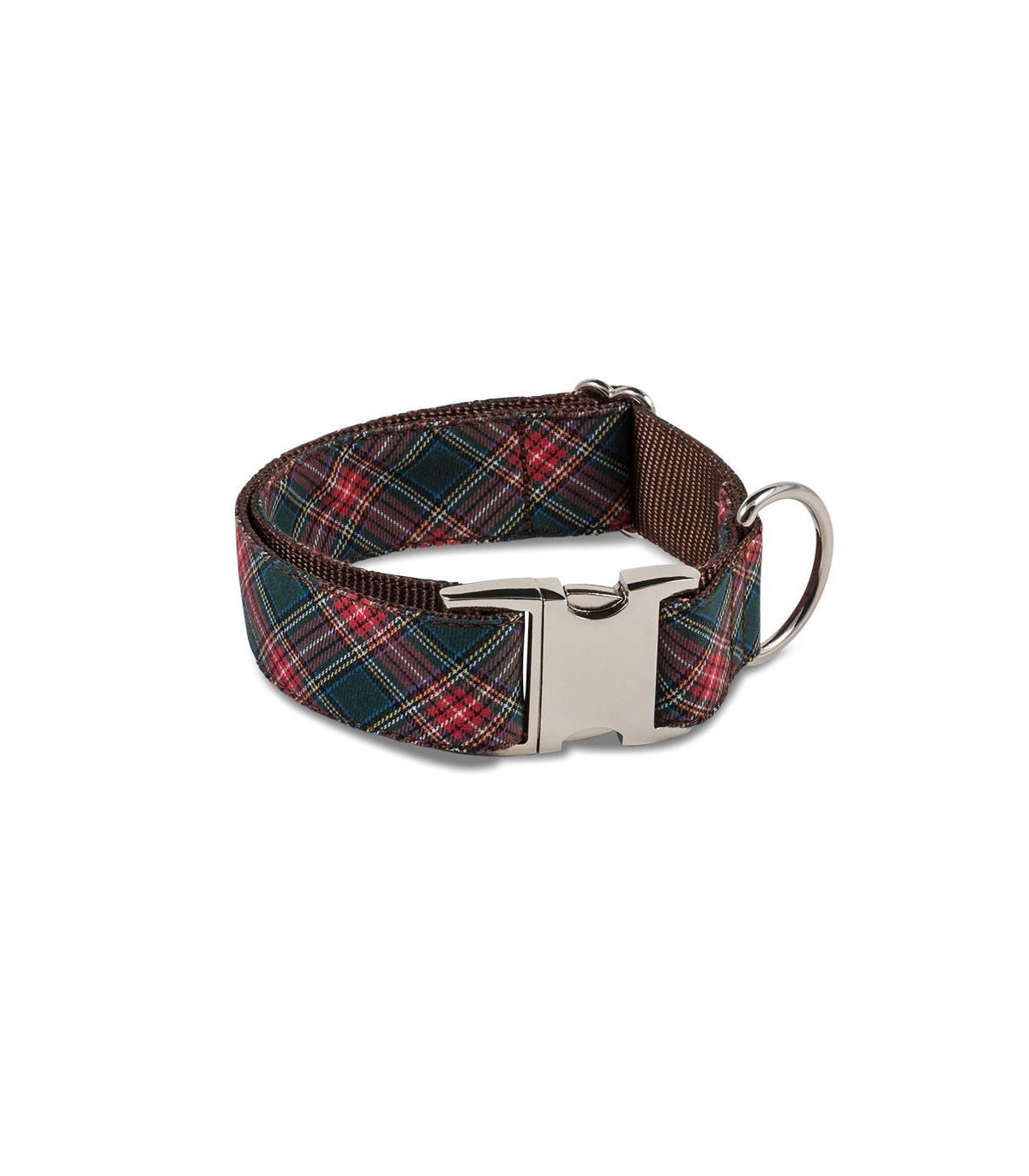 Este collar está diseñado y hecho a mano en España. Ha sido confeccionado con cinta de nylon de color marrón de alta calidad y tacto suave. Encima de la cinta de nylon, está cosido un tejido de algodón con estampado de cuadros al estilo tartán escocés.