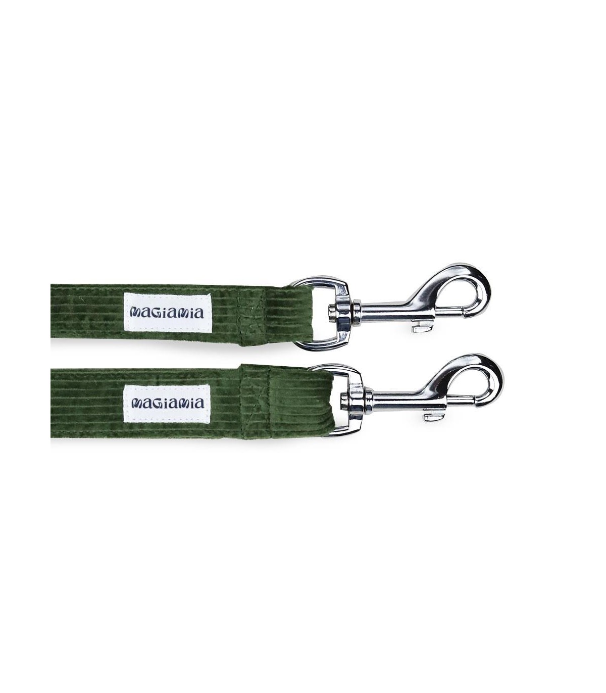 This multi-position leash is handcrafted with green corduroy fabric and nylon lining for reinforcement.