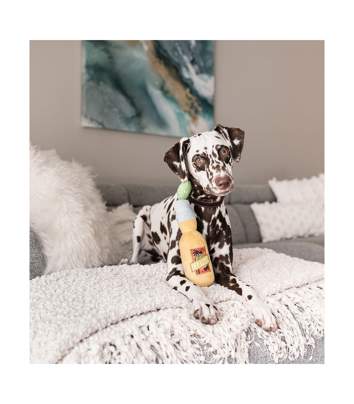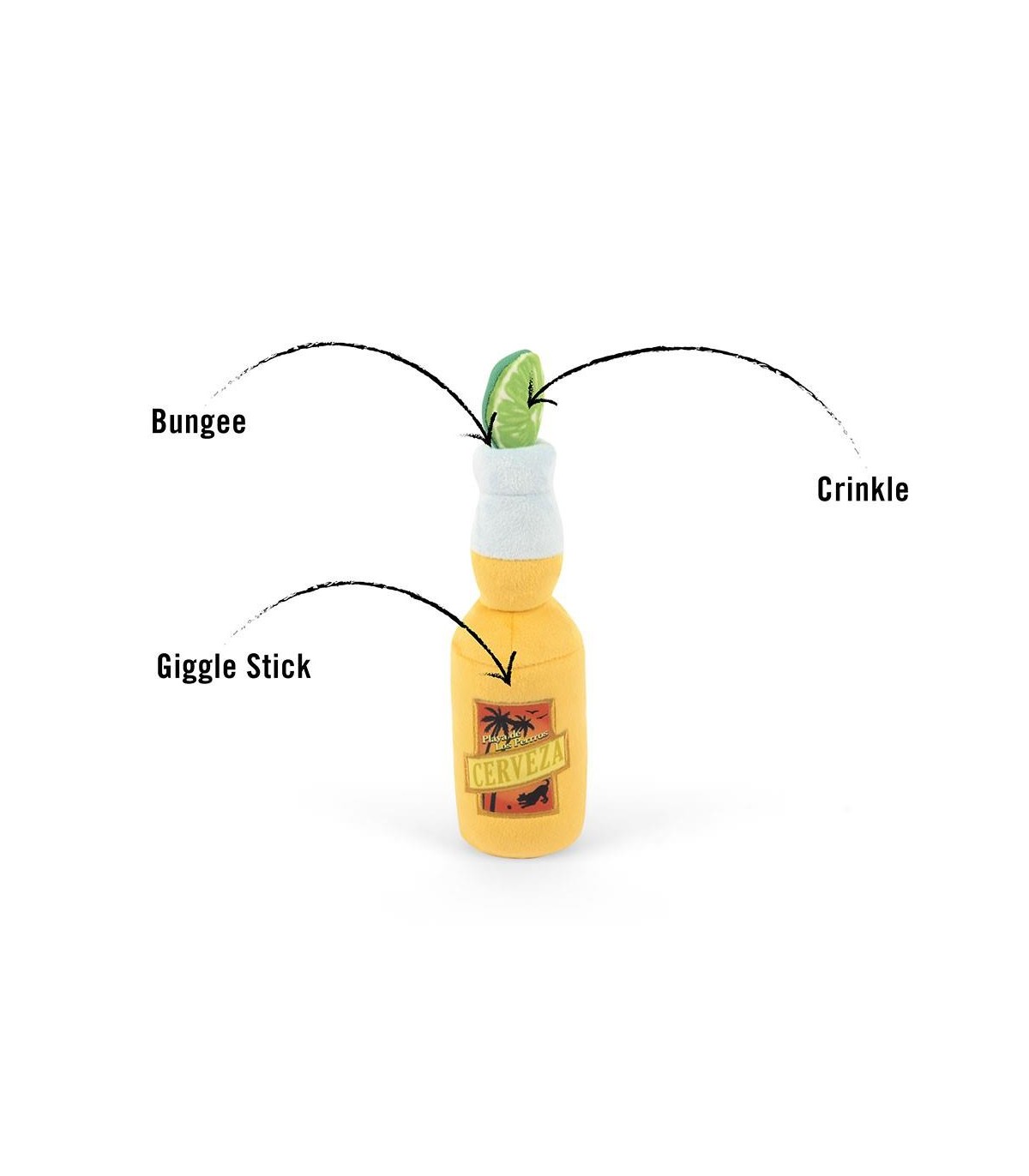 Dog toy from the brand P.L.A.Y. This plush toy in the shape of a Coronita beer bottle is soft and cuddly.