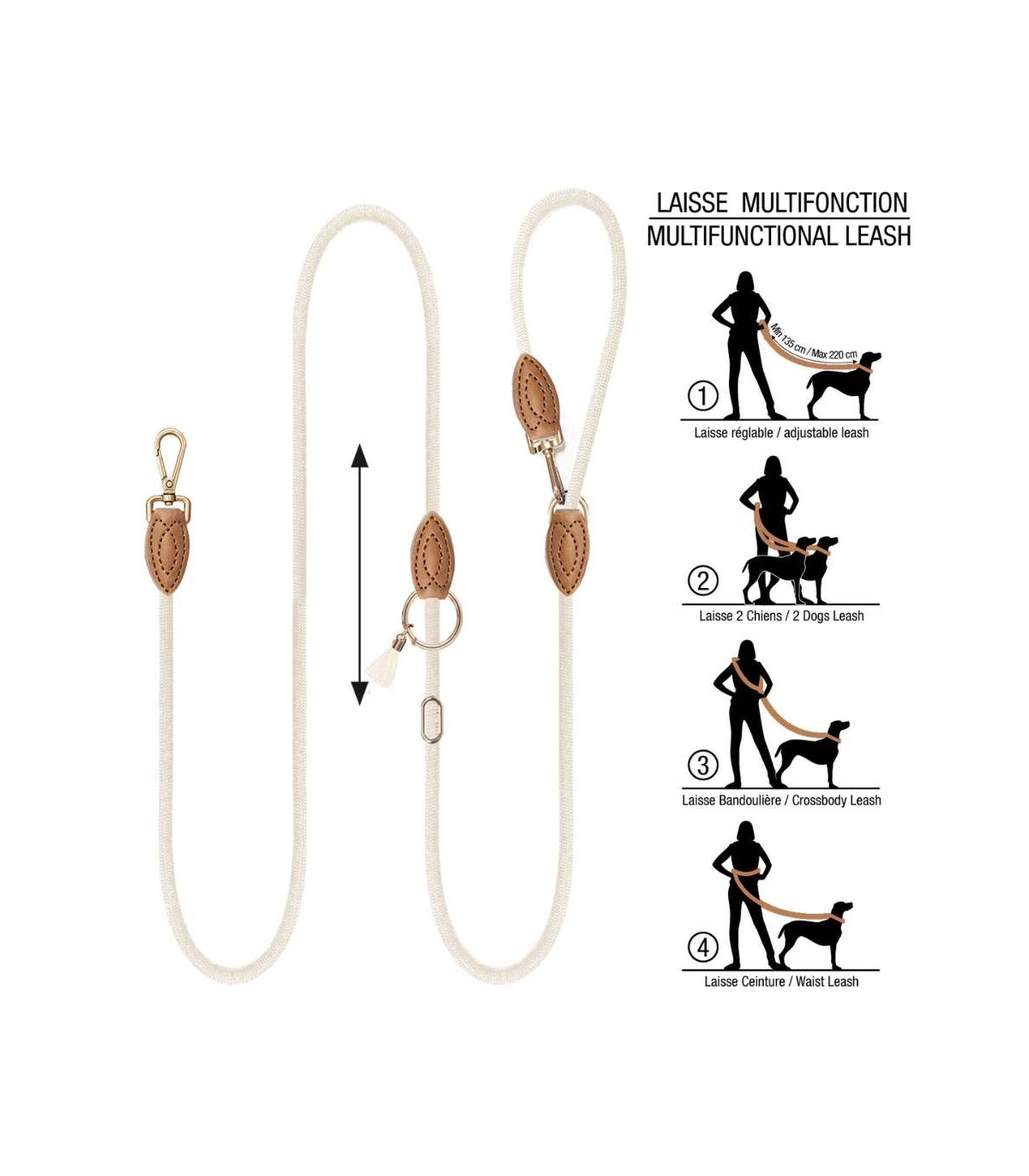 This leash made of resistant cream-colored cord with details in camel-colored leather and hardware in gold metal is a very versatile and comfortable option that adapts to any situation thanks to its length and the different hooks and carabiners it has. With them, you can carry it in the following ways: