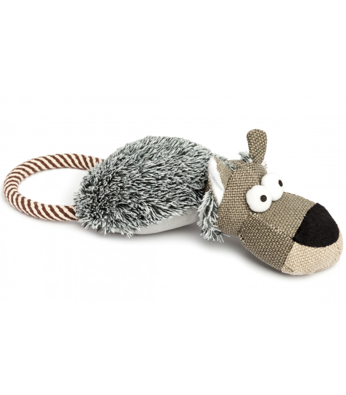 Plush toy for medium-sized dogs. This dog-shaped toy has different textures and features to keep your dog entertained: its body is soft plush, it has a cord to help clean their teeth, and inside the plush there is a soft squeaker (suitable for indoor play). Approximate measurements: 37 cm x 15 cm x 7 cm.