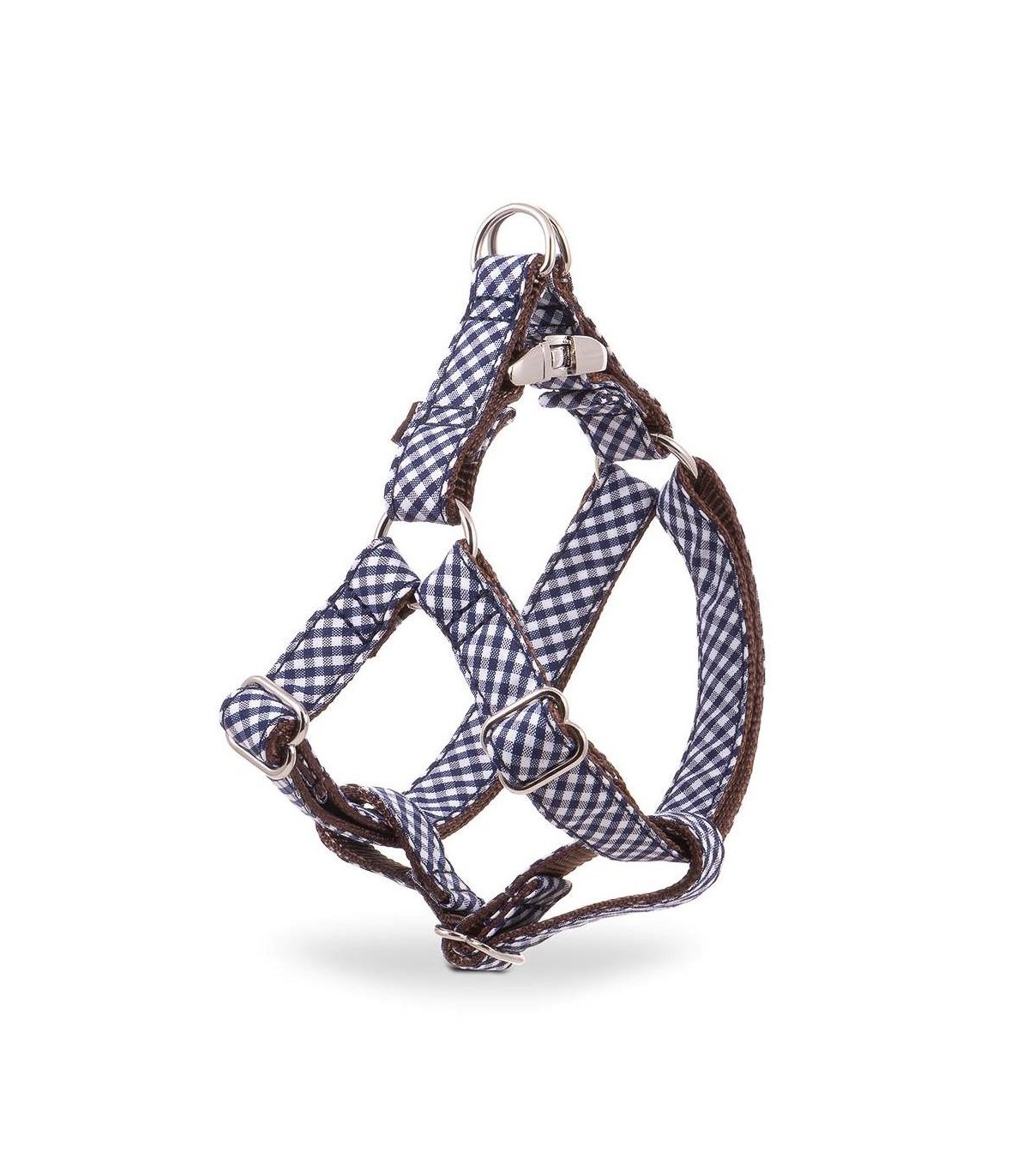 Este arnés está diseñado y hecho a mano en España. Ha sido confeccionado con cinta de nylon de color marrón de alta calidad y con un tacto agradable. Encima de la cinta de nylon está cosido un tejido de algodón con estampado de cuadros azul marino.