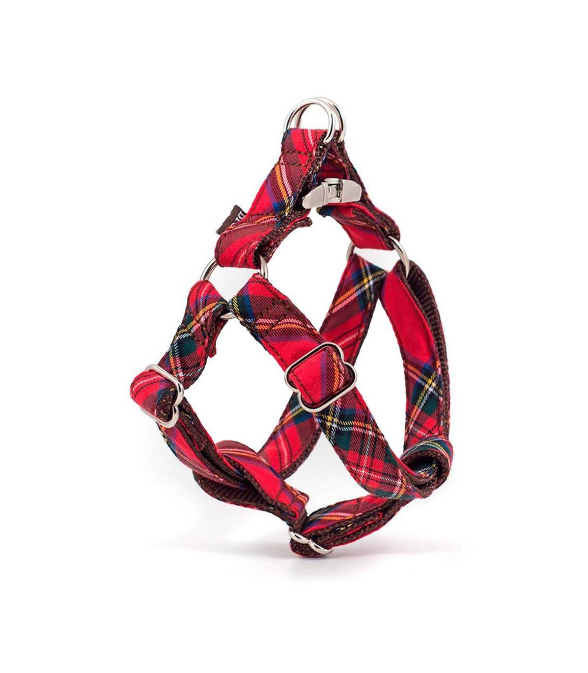 Este arnés está diseñado y hecho a mano en España. Ha sido confeccionado con cinta de nylon de color marrón de alta calidad y con un tacto agradable. Encima de la cinta de nylon está cosido un tejido de algodón con estampado al estilo tartán escocés.