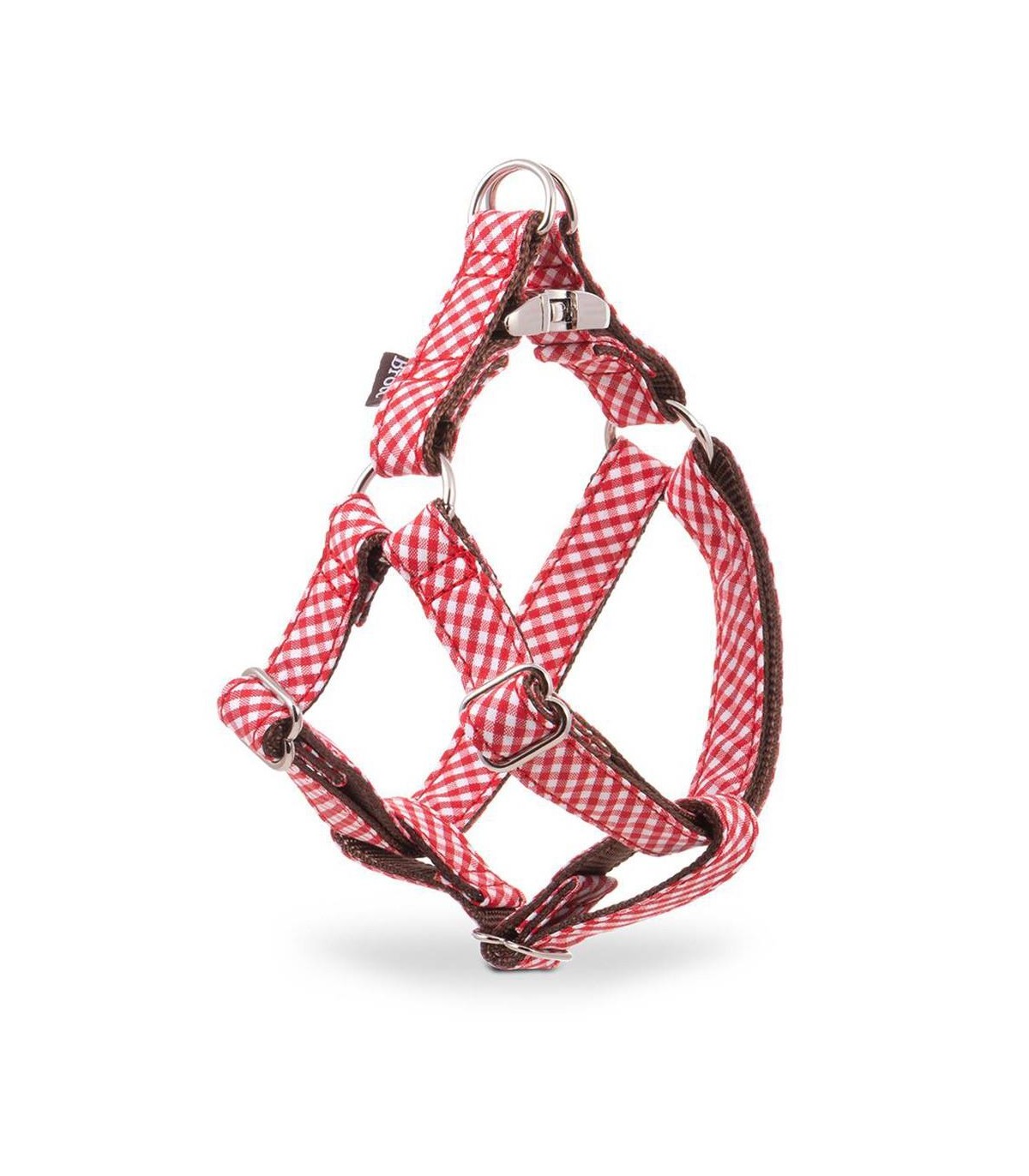 This harness is designed and handmade in Spain. It has been made with high-quality brown nylon webbing with a pleasant feel. On top of the nylon webbing, there is red and white checkered cotton fabric sewn.