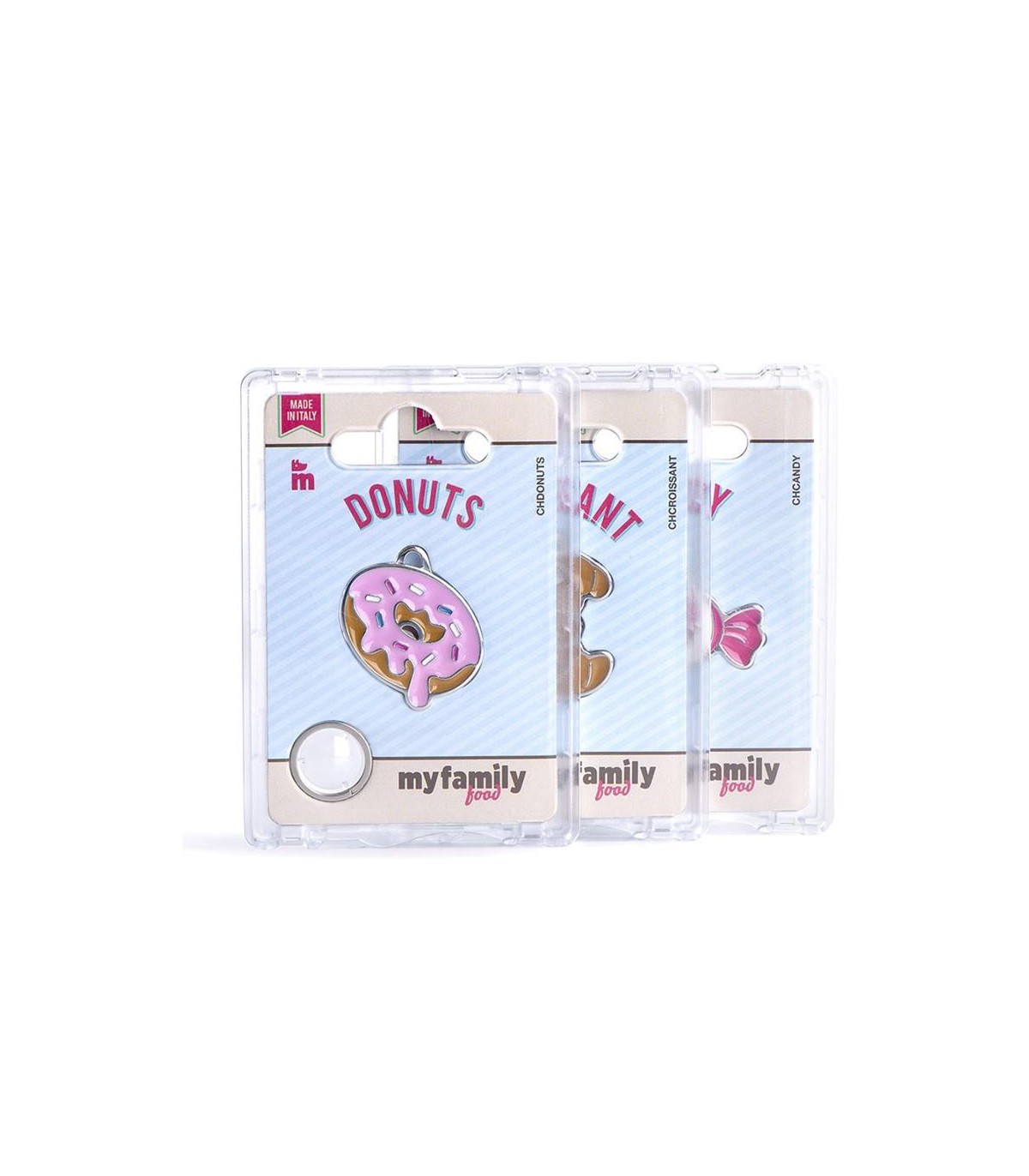 Chapa de identificación de la marca My Family. Está esmaltada a mano y realizada con materiales hipoalergénicos. Gracias a esta chapa, tu perro irá bien identificado al tener en su collar o arnés sus datos. Además, la forma de donut de fresa nos ha enamorado.