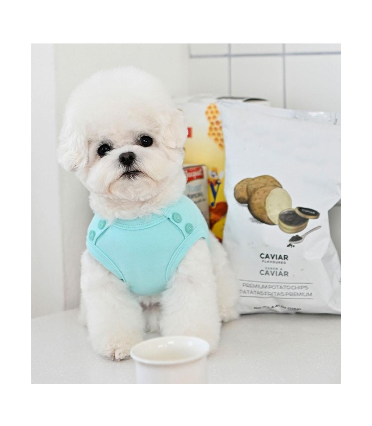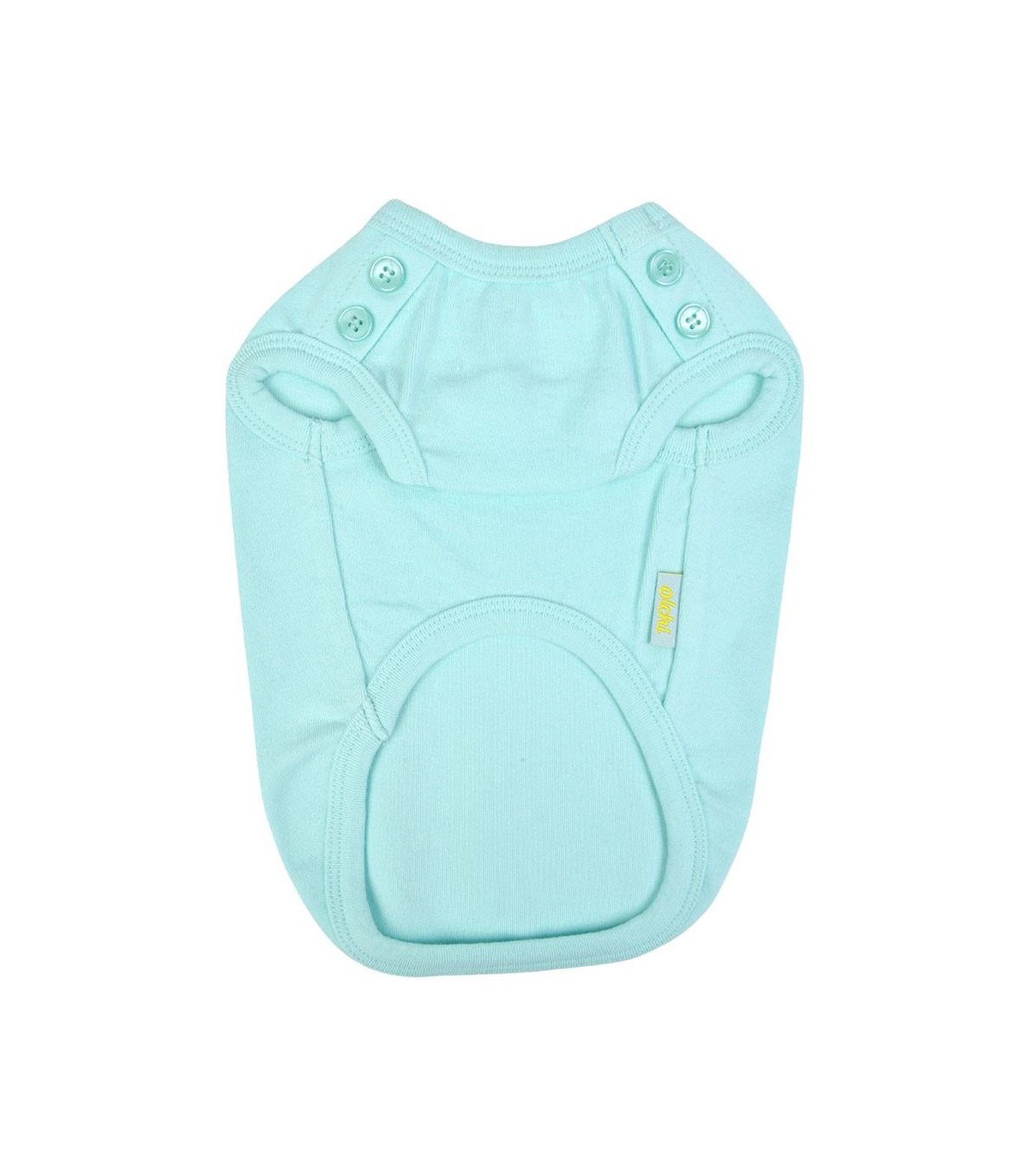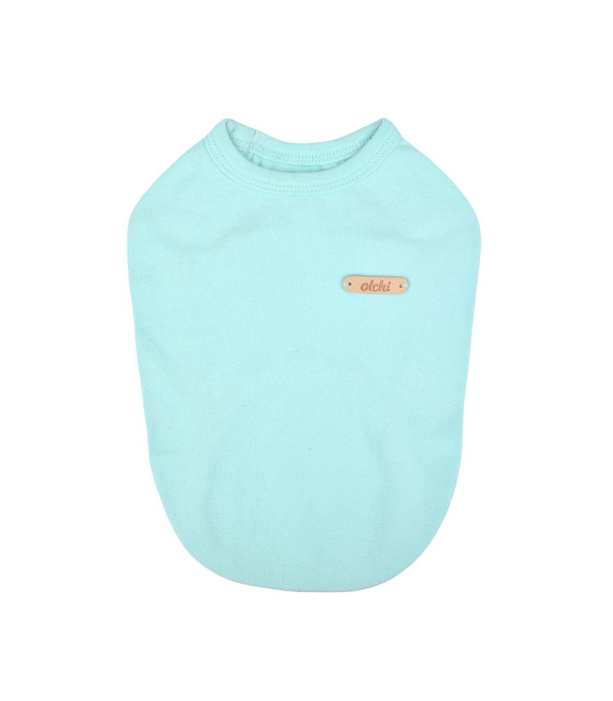 Camiseta para perro pequeño de la marca Olchi. En color azul celeste y detalle de botones en la zona de los hombros.