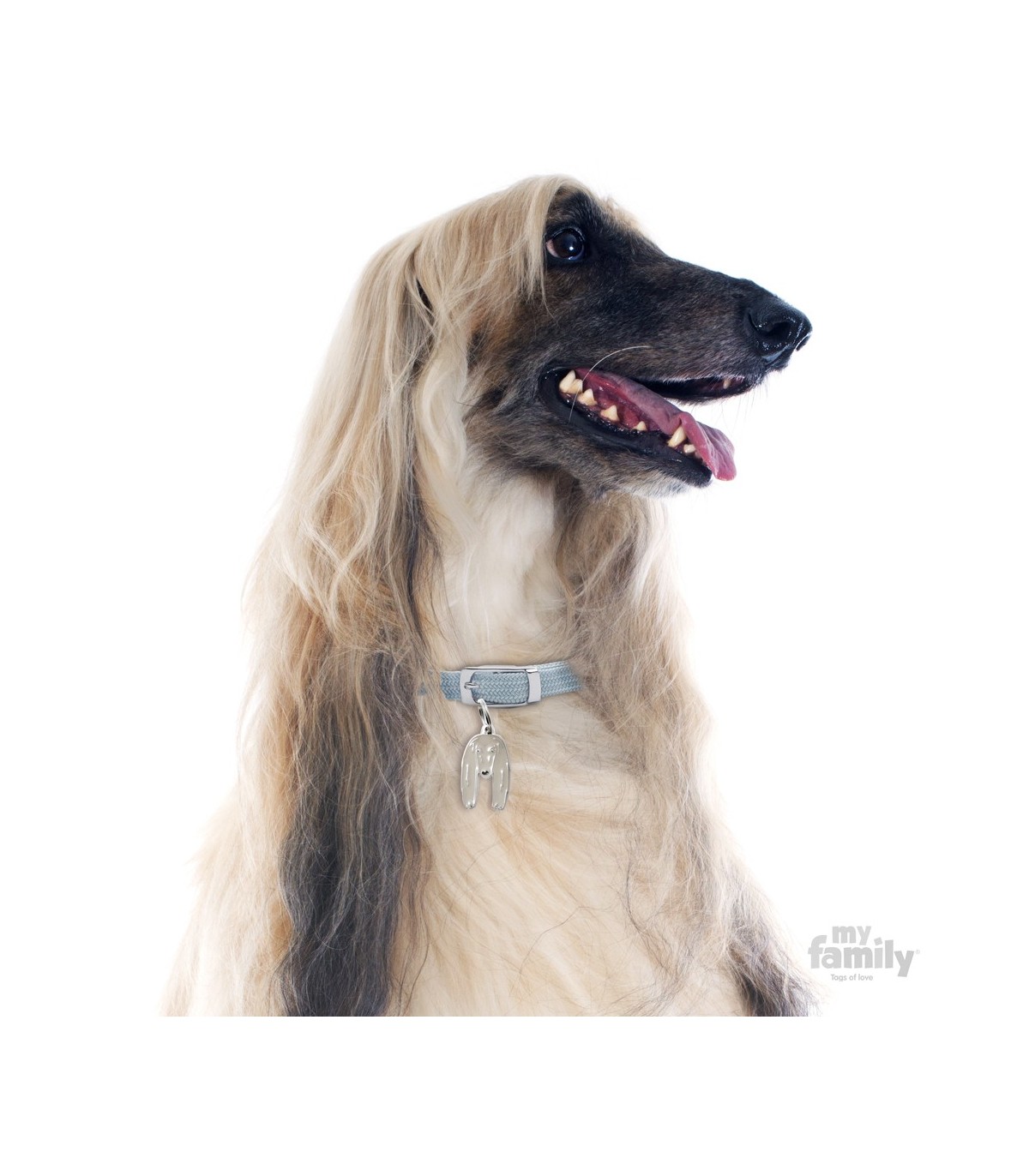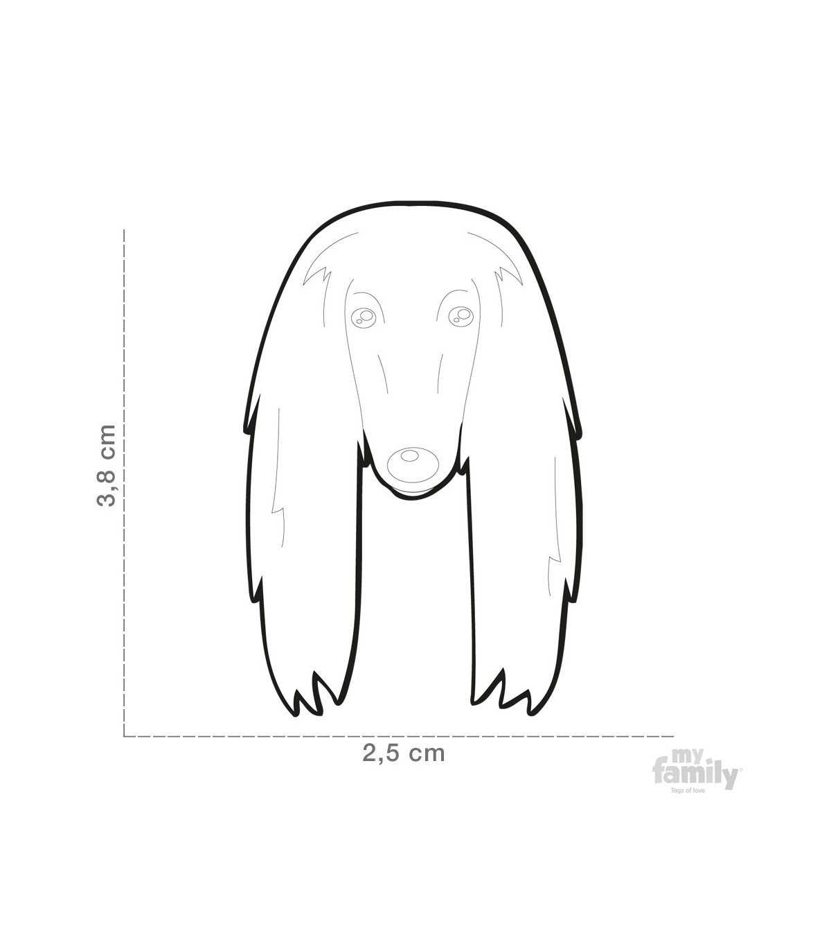 "Identification tag for dogs from the brand My Family. It is hand-enameled and made with hypoallergenic materials. Thanks to this tag, your dog will be well identified by having their information on their collar or harness. It is perfect for Afghan Hounds. This tag can be personalized on the back, free of charge, with up to 3 lines (pet's name, phone number, etc.), however, due to its size, we recommend personalizing it with a maximum of 2 lines. Simply tell us what to put on each line below in ""Customize product"" and save before adding the product to your shopping cart."