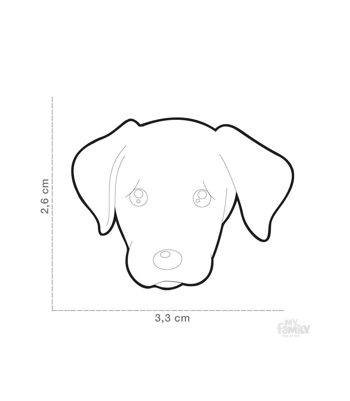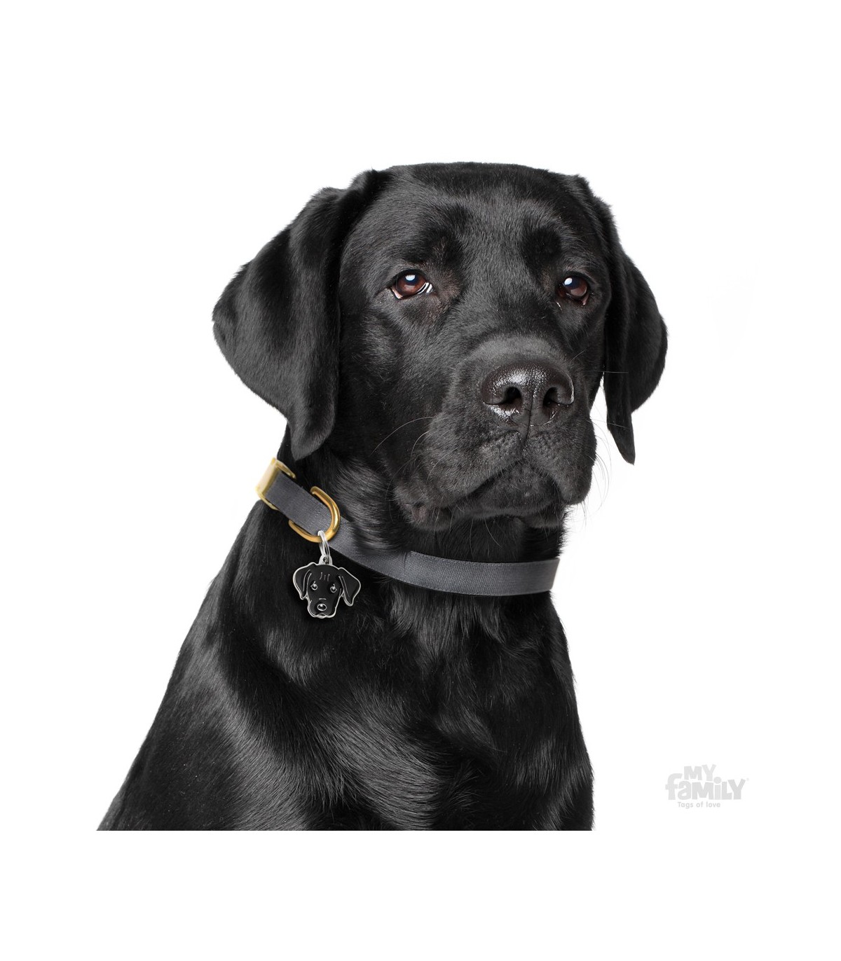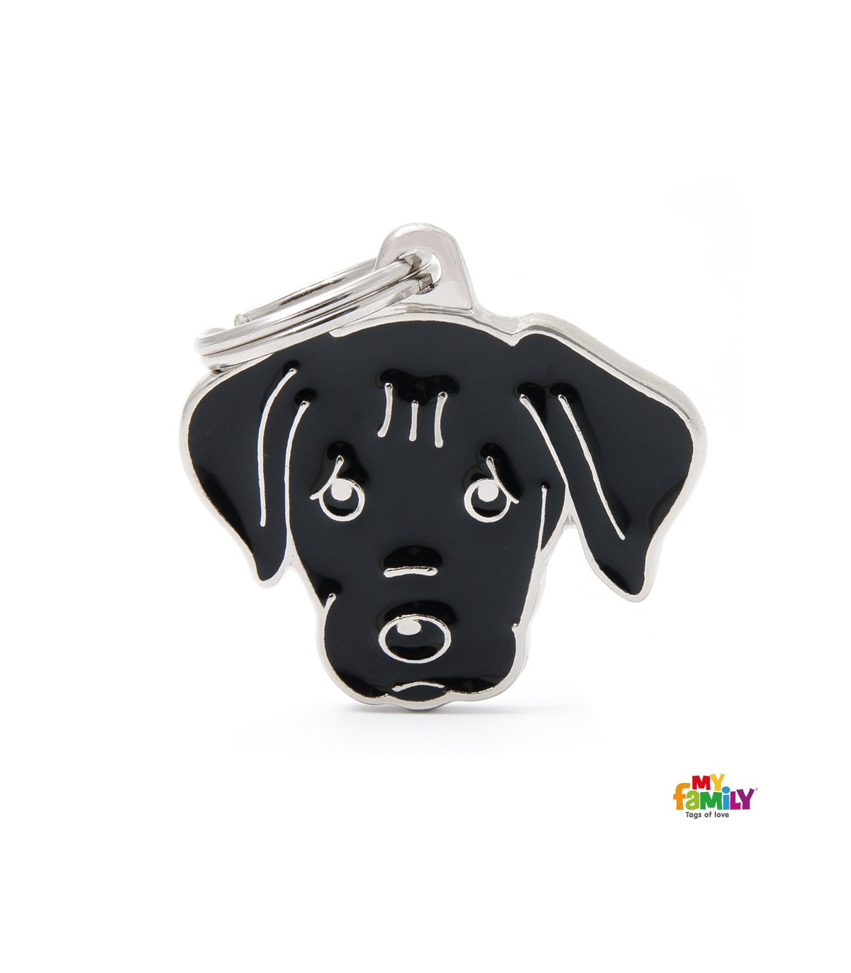 Chapa de identificación de la marca My Family con el retrato de un labrador. Está esmaltada a mano y realizada con materiales hipoalergénicos. Gracias a esta chapa, tu perro irá bien identificado al tener en su collar o arnés sus datos.