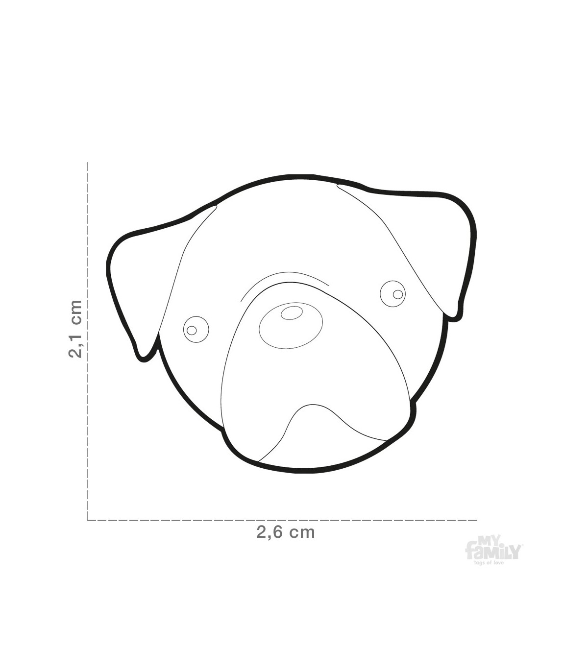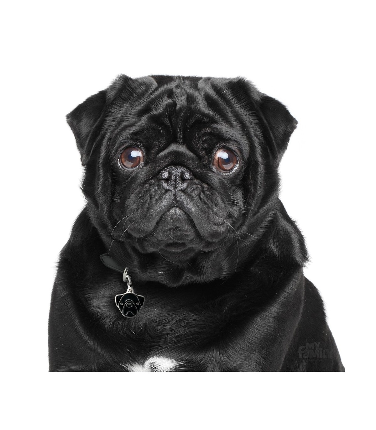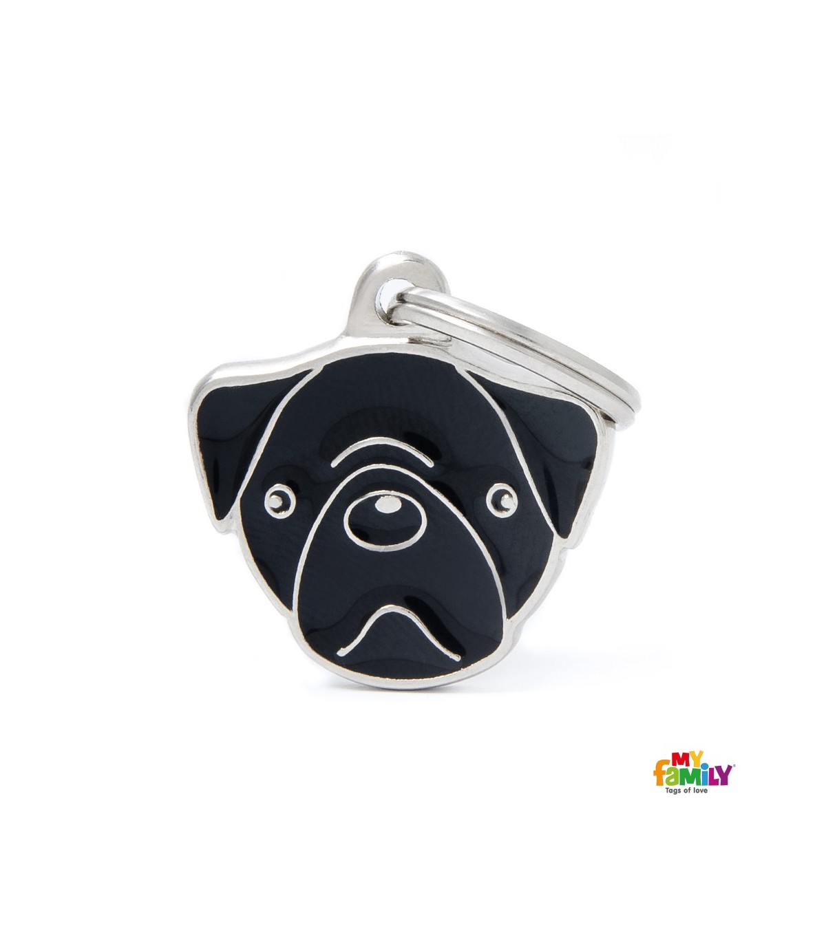 Chapa de identificación de la marca My Family con el retrato de un carlino. Está esmaltada a mano y realizada con materiales hipoalergénicos. Gracias a esta chapa, tu perro irá bien identificado al tener en su collar o arnés sus datos.