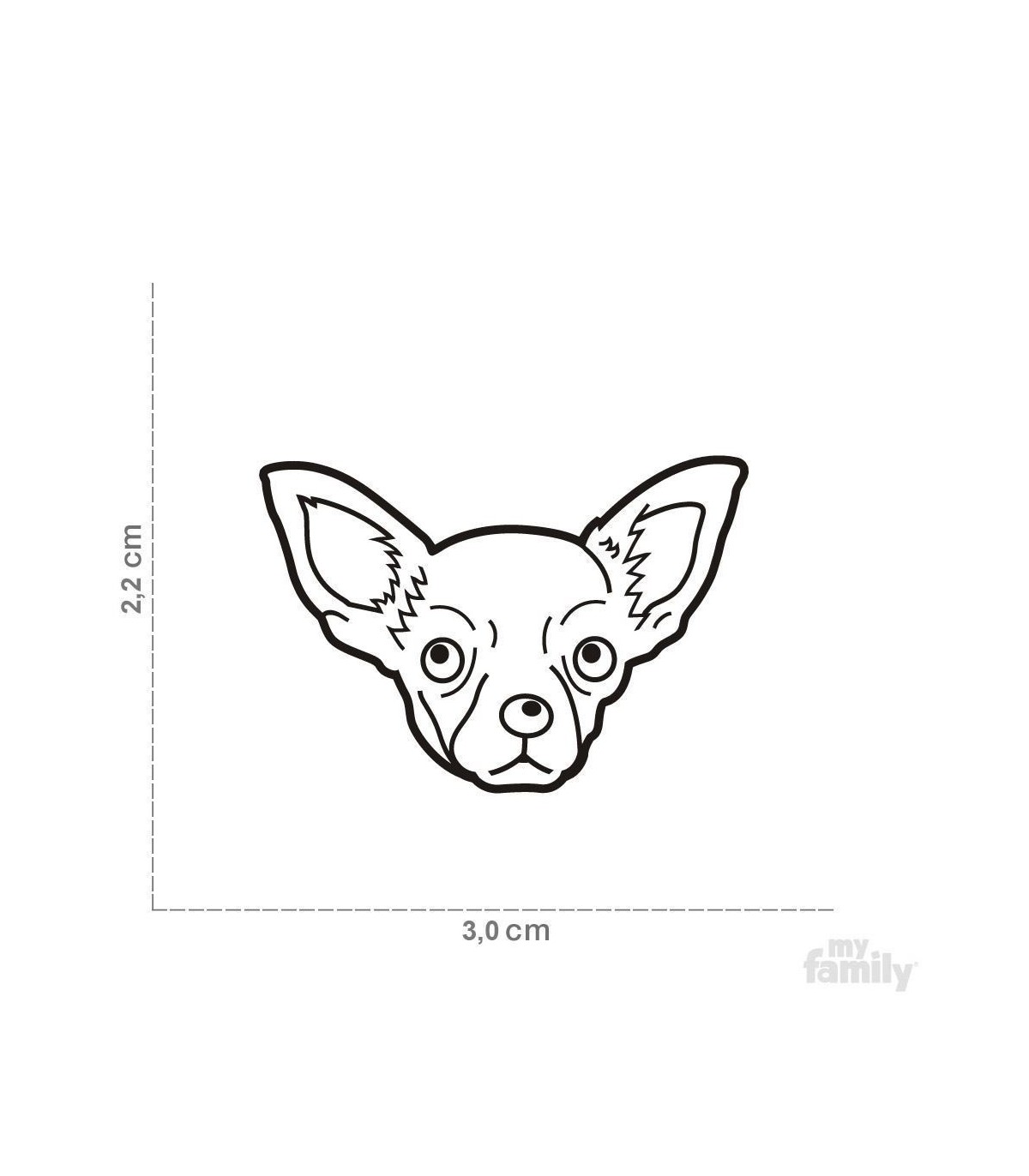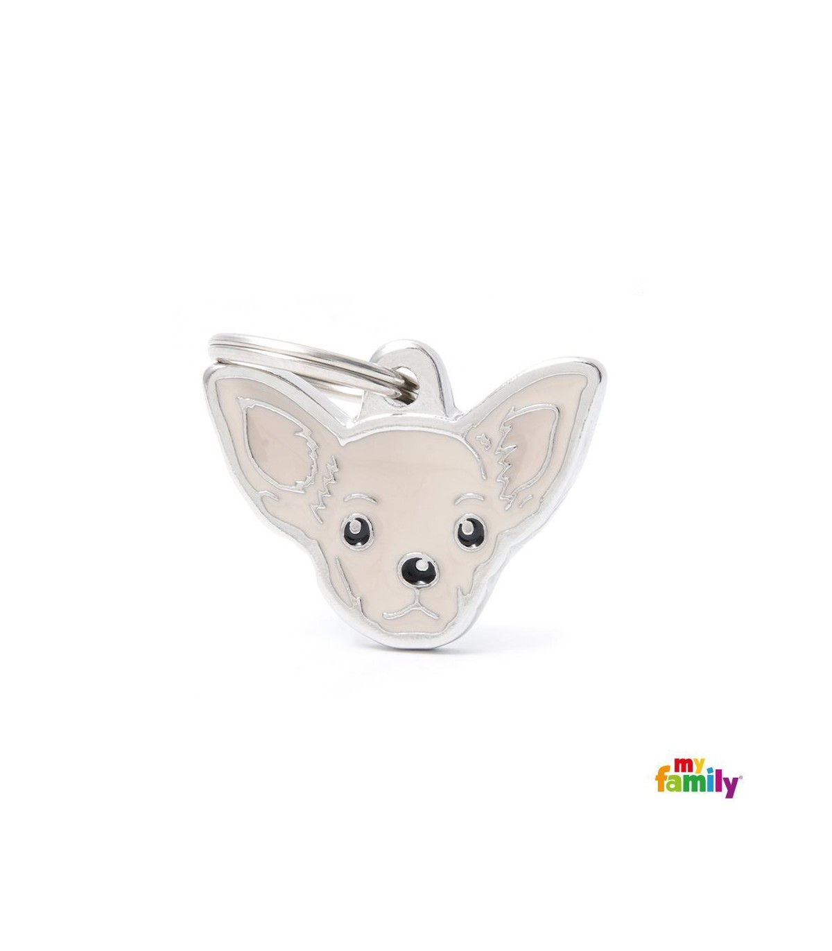 Chapa de identificación de la marca My Family con el retrato de un chihuahua. Está esmaltada a mano y realizada con materiales hipoalergénicos. Gracias a esta chapa, tu perro irá bien identificado al tener en su collar o arnés sus datos.