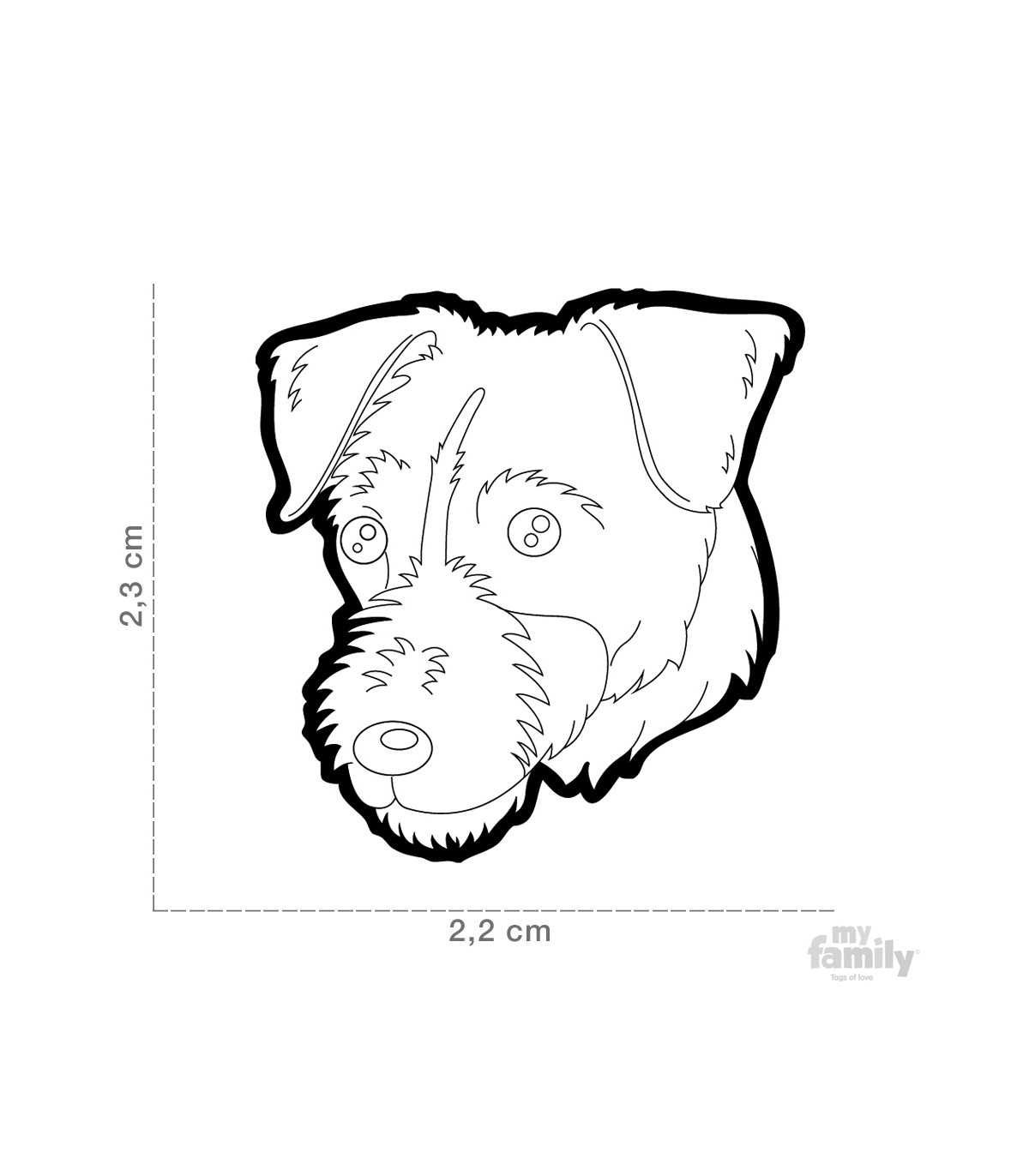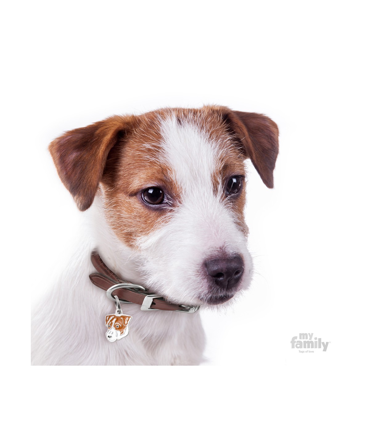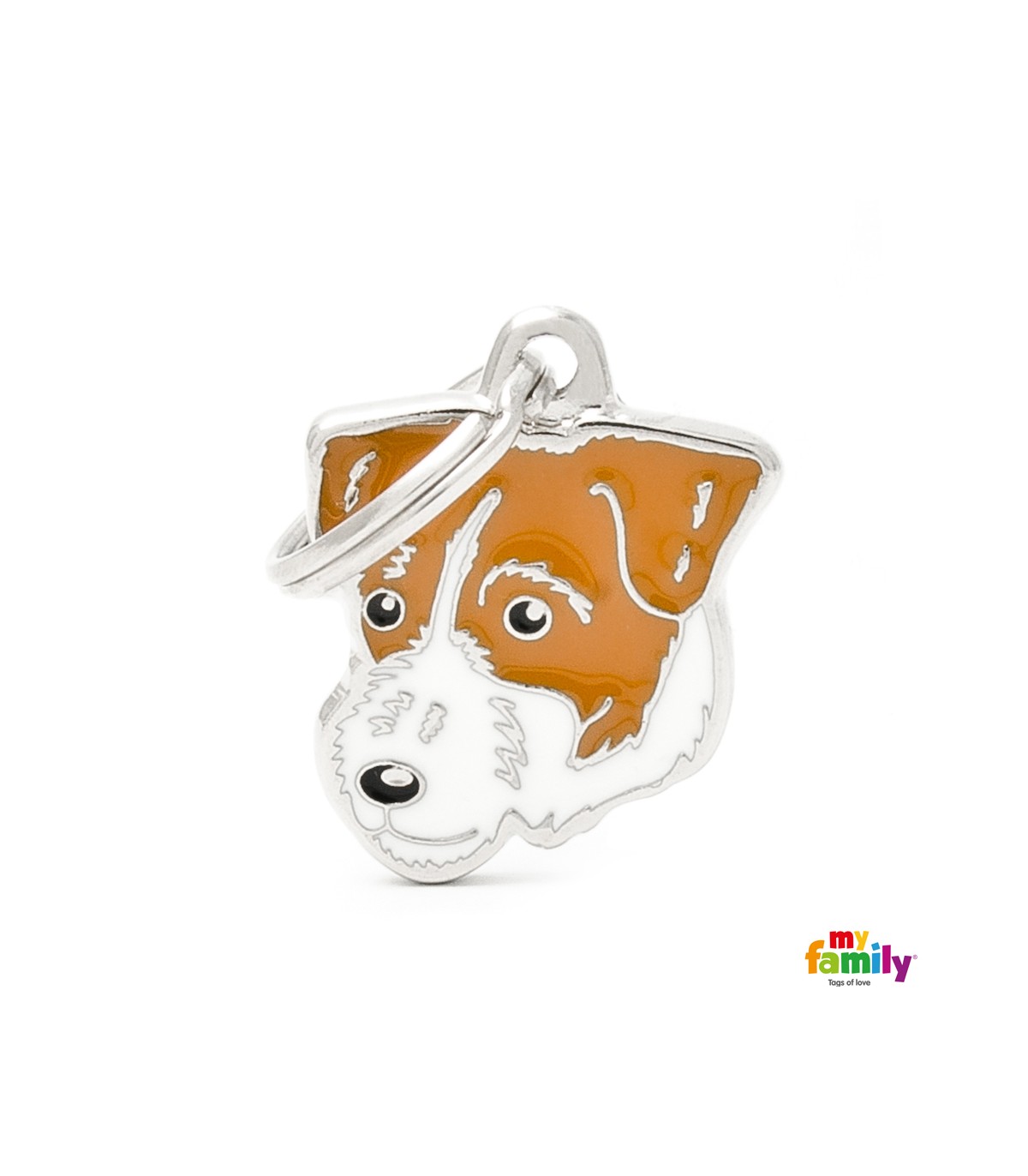 Chapa de identificación de la marca My Family con el retrato de un Jack russell. Está esmaltada a mano y realizada con materiales hipoalergénicos. Gracias a esta chapa, tu perro irá bien identificado al tener en su collar o arnés sus datos.