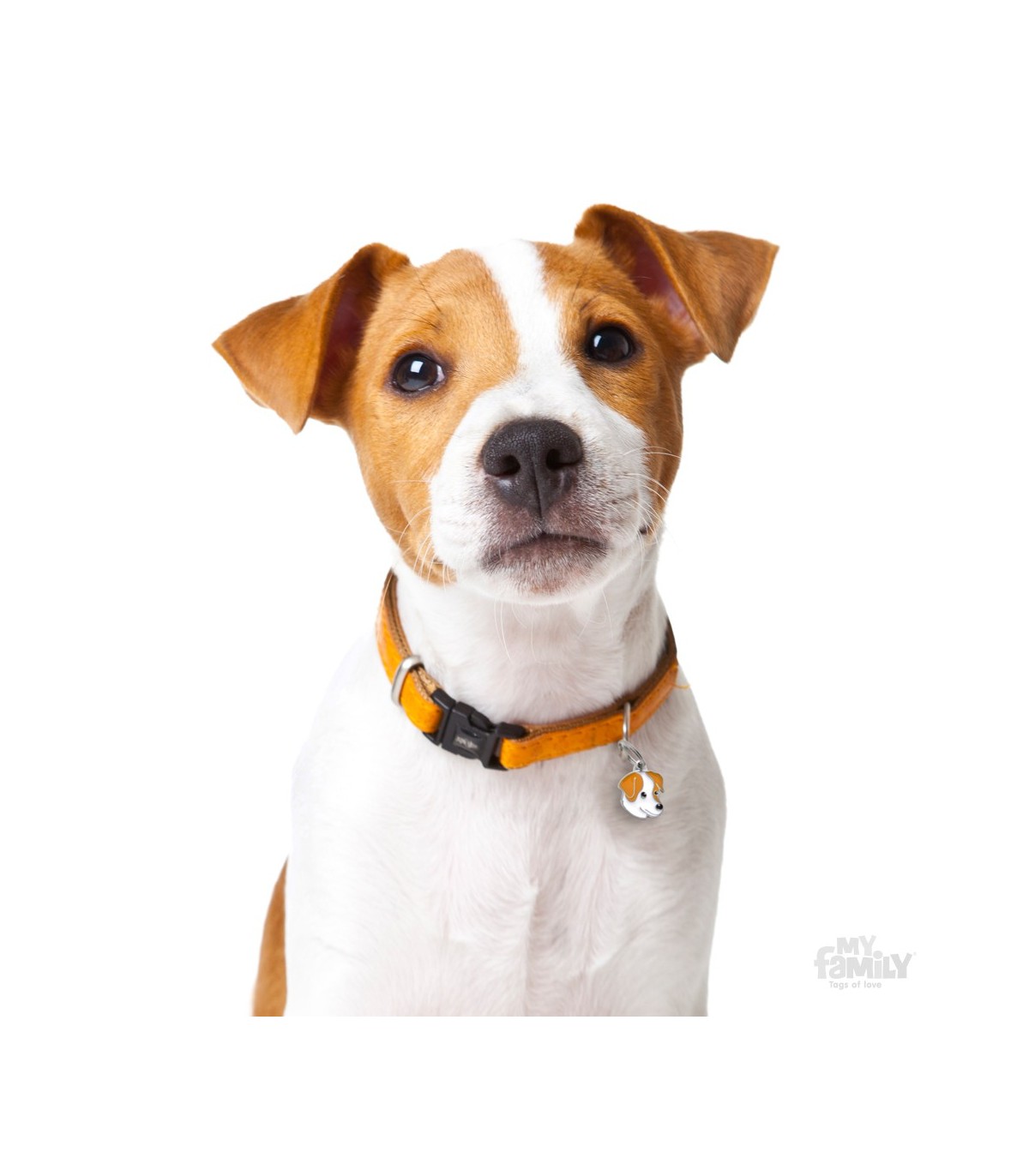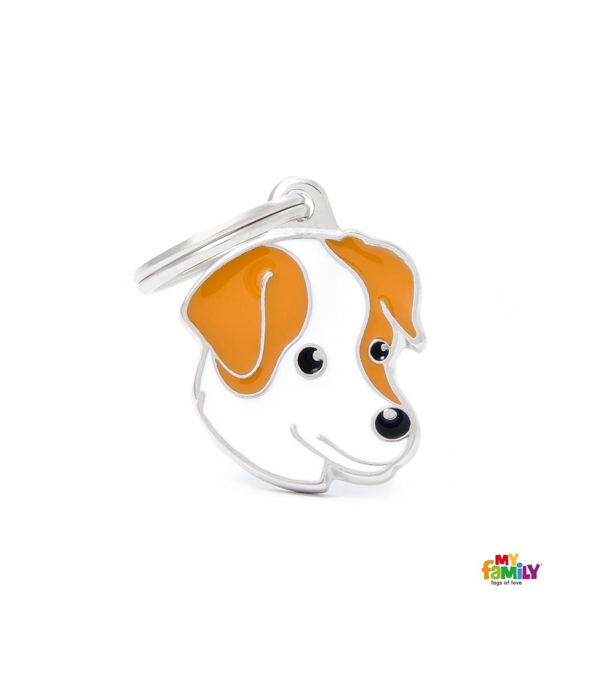 Chapa de identificación de la marca My Family con el retrato de un Jack russell. Está esmaltada a mano y realizada con materiales hipoalergénicos. Gracias a esta chapa, tu perro irá bien identificado al tener en su collar o arnés sus datos.