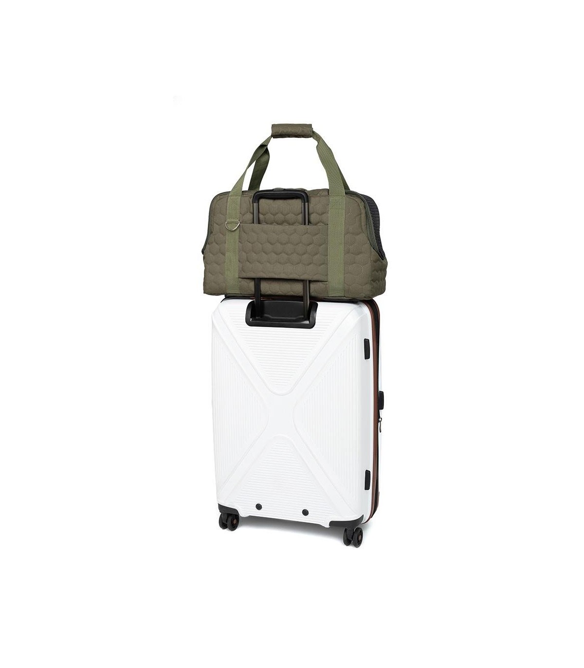 The bag features two short handles and an adjustable shoulder strap. This allows you to carry it over your shoulder or across your body, keeping your hands free. Additionally, it has a strap on the back to attach it to a suitcase/trolley for convenient transport. To prevent your small dog from jumping out and escaping when the bag is open, it has a strip with an interior carabiner to secure your pet.