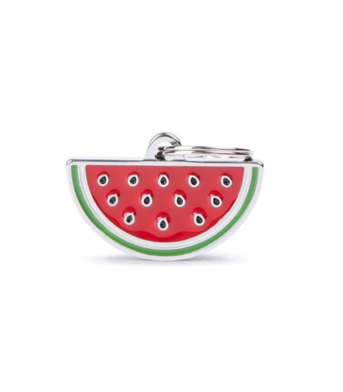 Identification tag from the brand My Family in the shape of a watermelon slice.