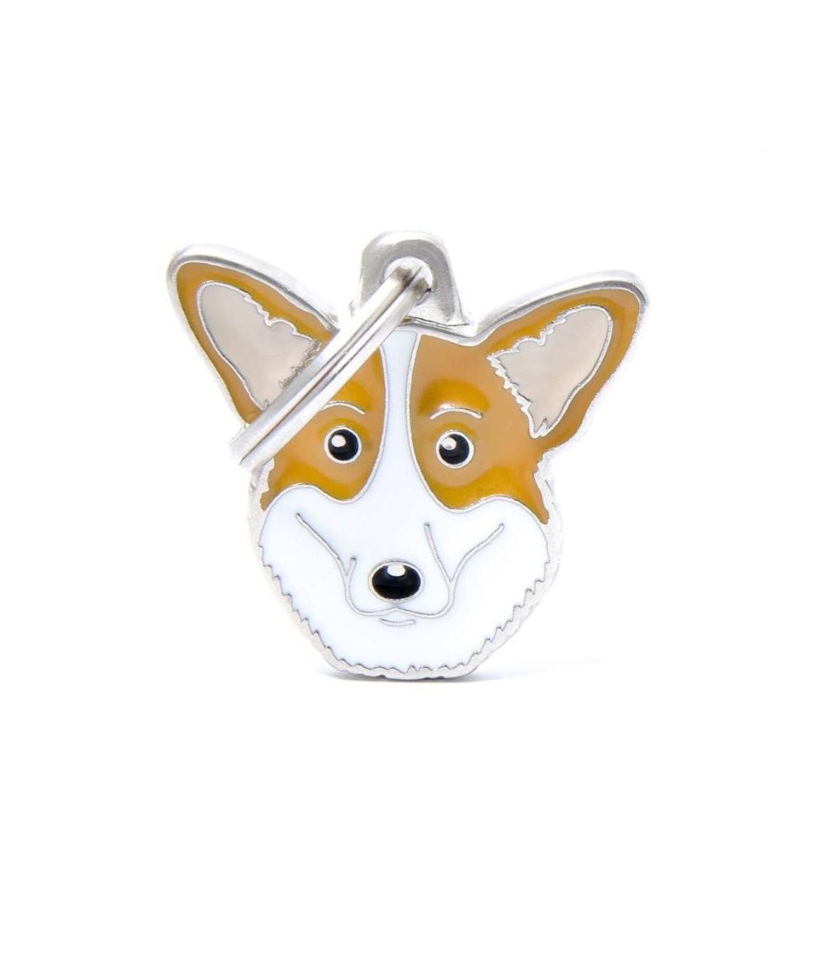 Identification tag from the brand My Family featuring a corgi face.