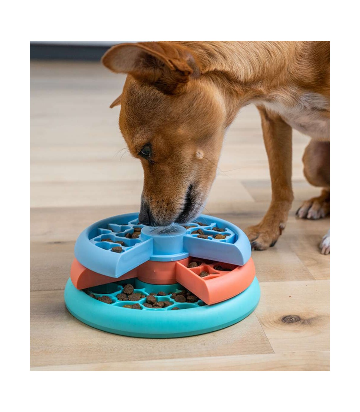 This toy or feeder, depending on how you look at it, consists of three trays, two of which are rotatable. The trays have holes to place wet food, BARF, snacks, yogurts, kefir or even fruit or other foods that your dog likes. While trying to eat these foods, your dog will move the trays and will have to make an extra effort to reach and eat everything.