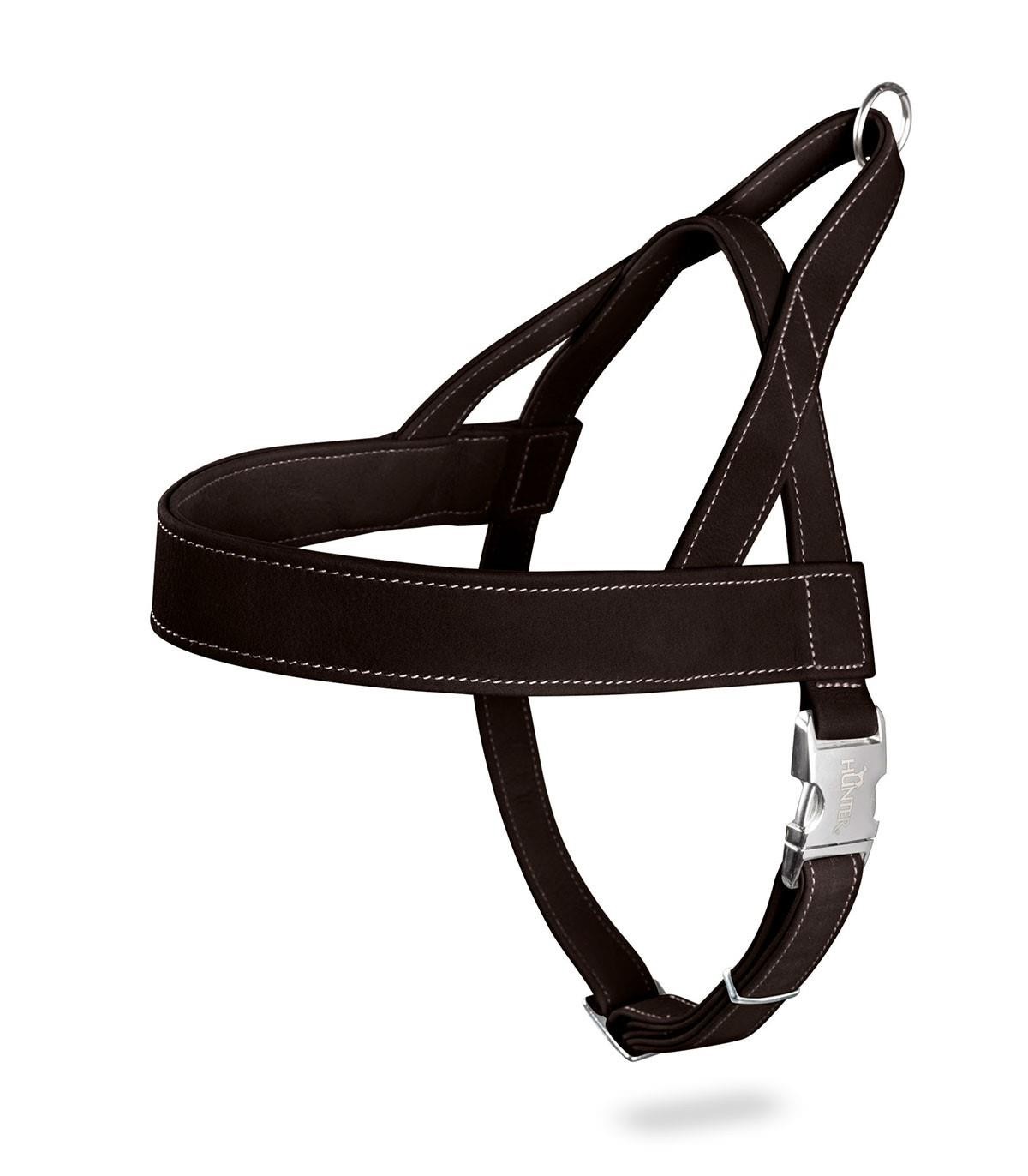 Arnés de piel de altísima calidad para perro, de la marca alemana Hunter. Fabricada en piel de nobuck de tacto suave, textura mate, semi flexible y muy resistente al uso. Con un toque artesanal destacado por el remate con puntadas en beige.