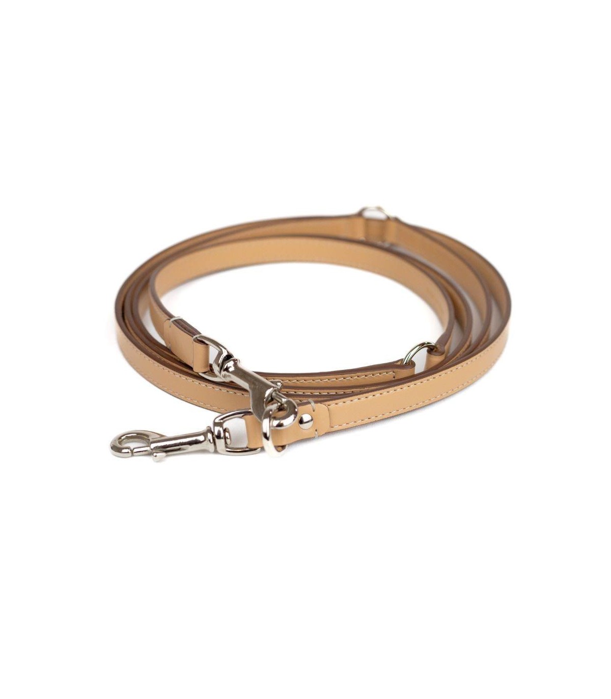 This leash is especially long and includes three rings and two snap hooks to adjust the length to your liking. You can use it in the traditional way, providing extra length for your furry friend to explore calmly. You can also wear it as a shoulder strap, keeping your hands free. A practical, multifunctional, elegant, and timeless leash.