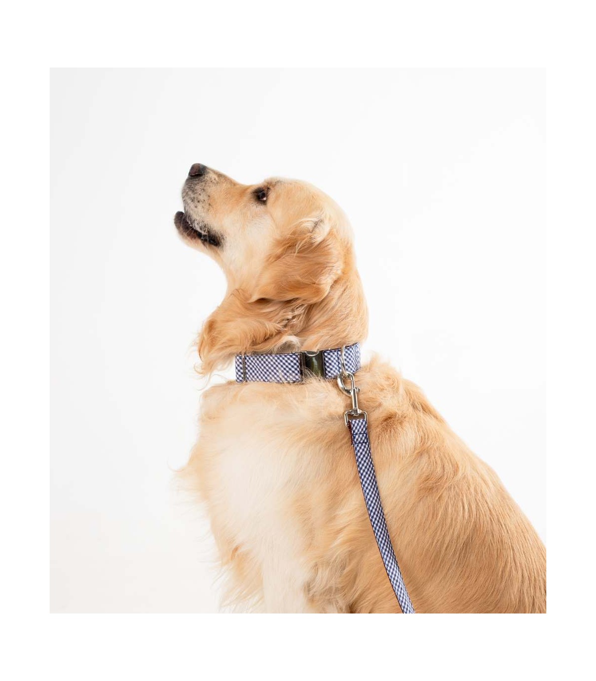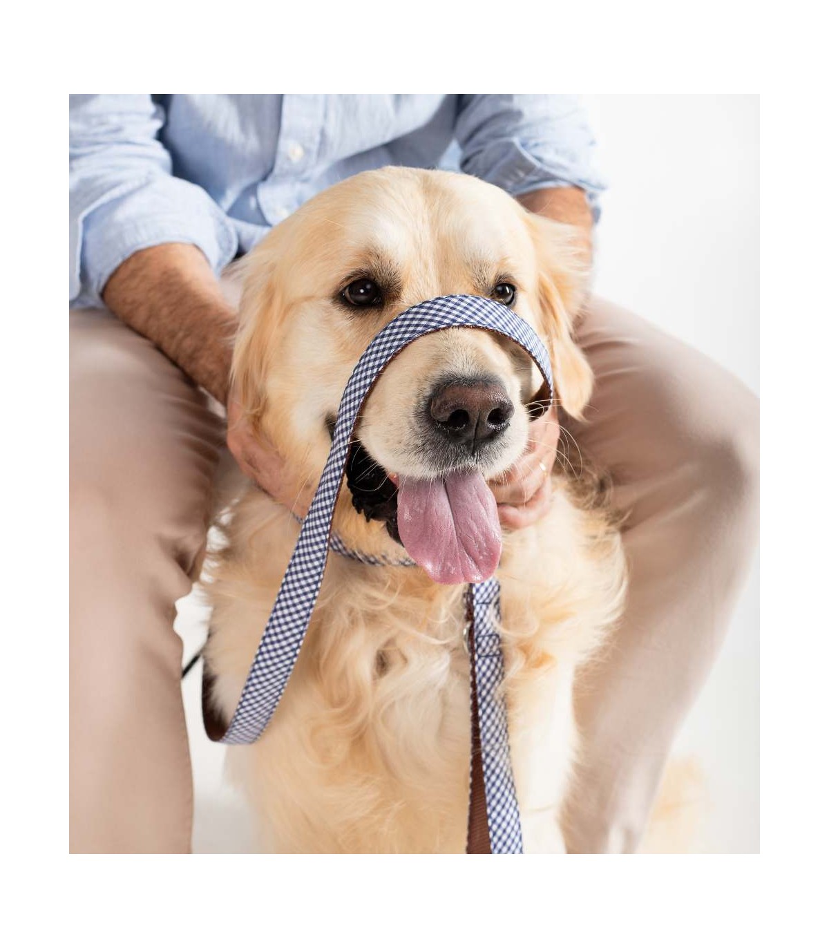 Esta correa está diseñada y hecha a mano en España. Ha sido confeccionada con cinta de nylon de color marrón de alta calidad. Encima de la cinta de nylon, está cosido un tejido de algodón con estampado de cuadros azul marino.