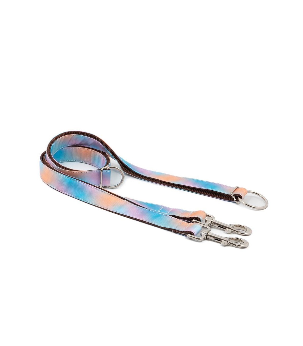 This leash is designed and handmade in Spain. It has been made with high-quality brown nylon ribbon. On top of the nylon ribbon, a cotton fabric with a gradient print in purple, blue, and orange colors is sewn.