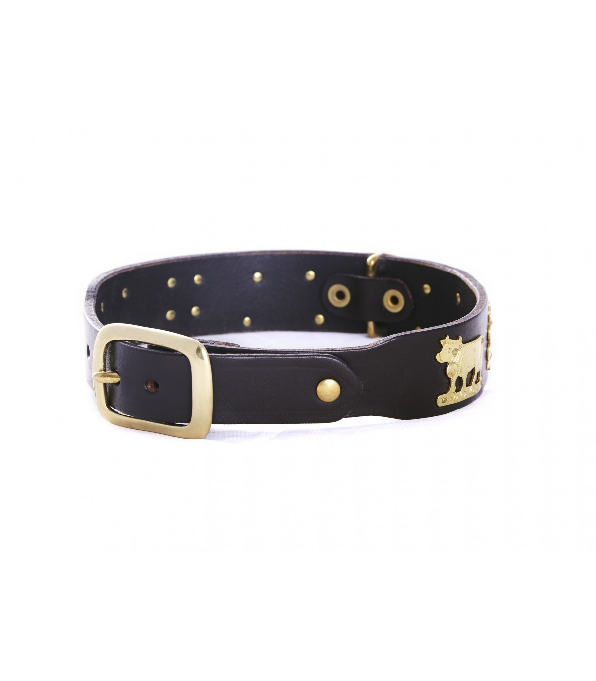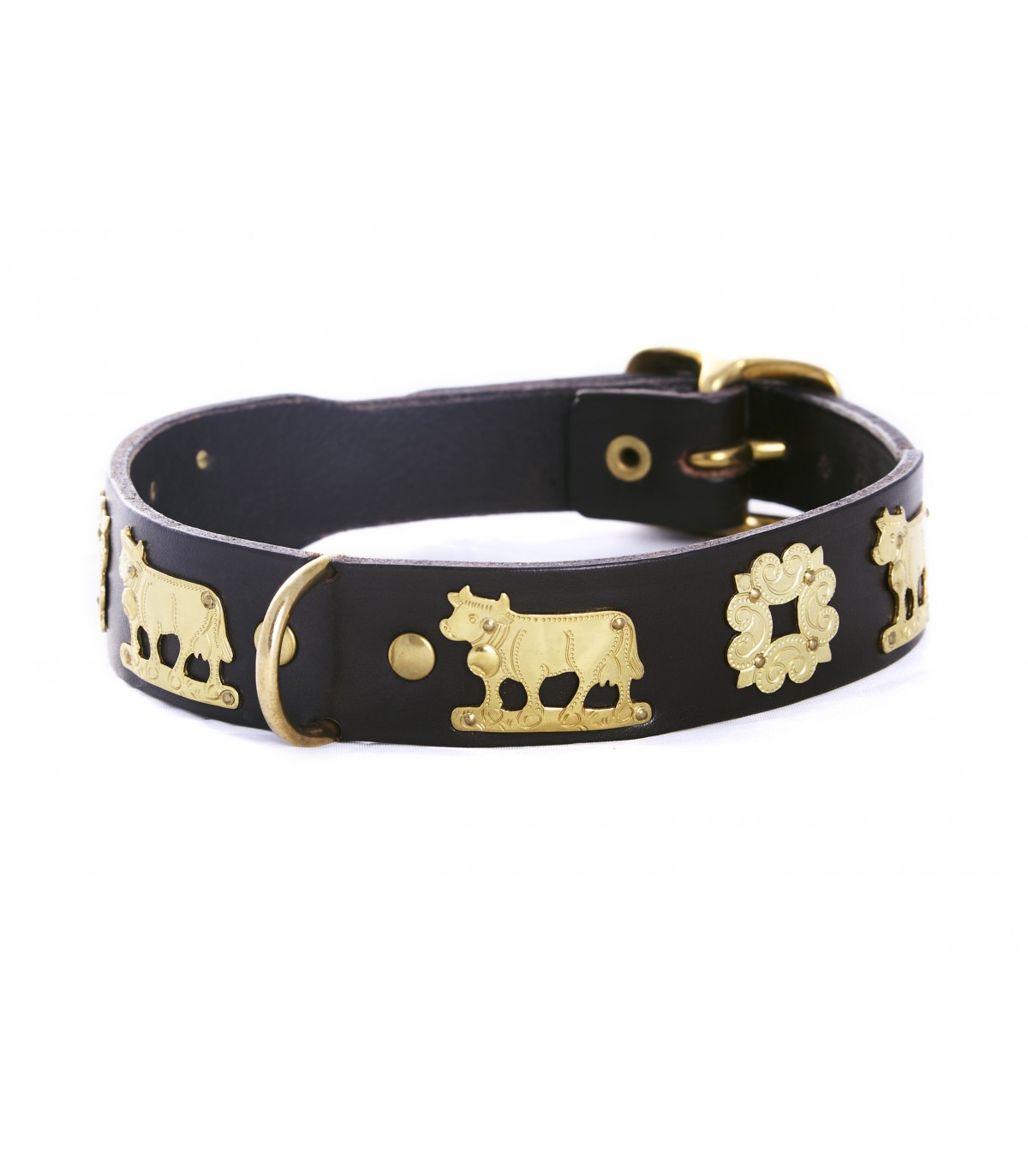 Collar para perro de la marca Thildy. Este collar, realizado a mano en Suiza con excelente piel de vacuno, es el típico collar de ese país con los adornos de latón tradicionales suizos.